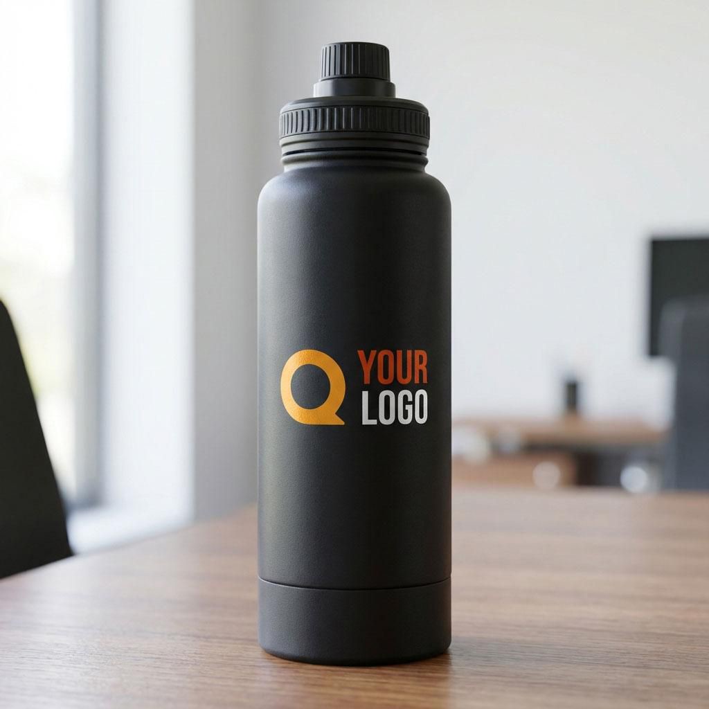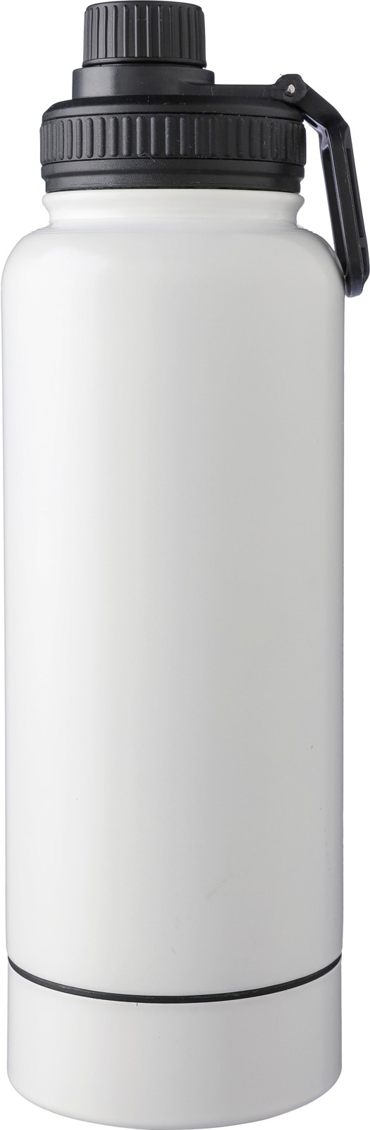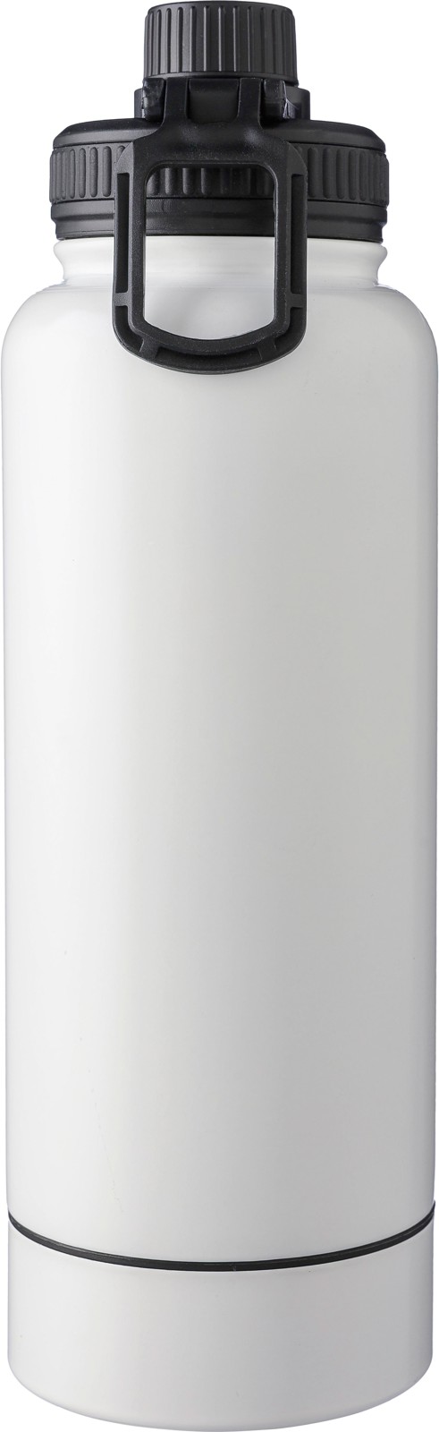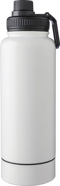 Garrafa em aço inoxidável com parede dupla (1000 ml). Possui uma tampa em PP com um dispensador de rosca e uma alça de transporte. O fundo inclui um pequeno compartimento de rosca para armazenagem. O interior é feito de aço inoxidável 304 e o exterior é de aço inoxidável 201. Apresentada individualmente numa caixa de cartão castanha.