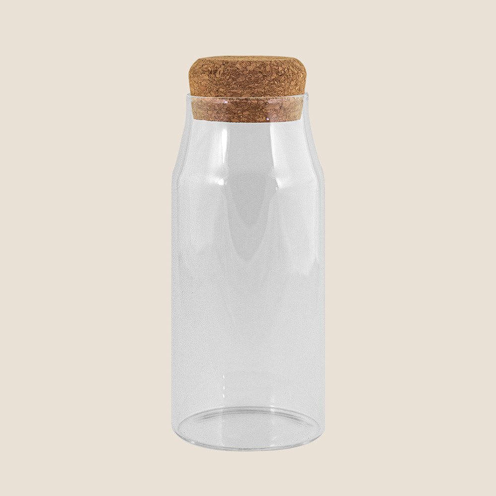 Garrafa fabricada em borosilicato com 600 ml de capacidade e tampa de cortiça.
