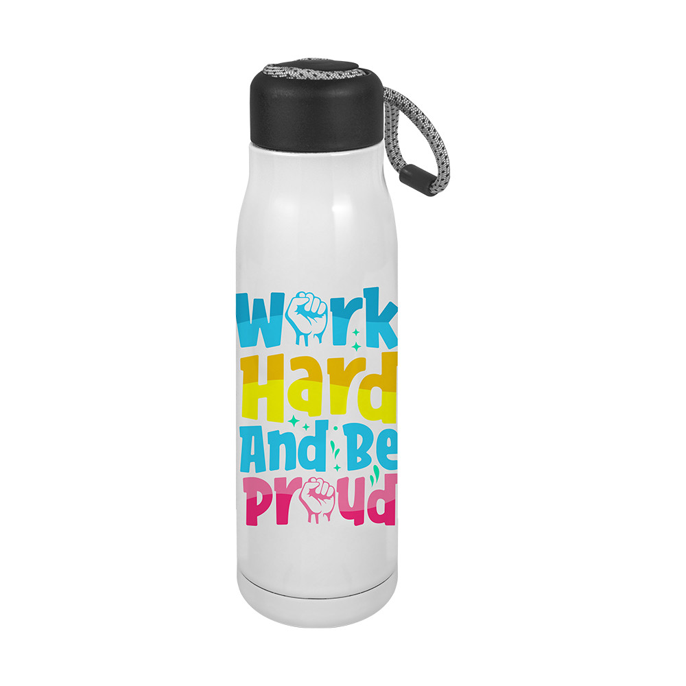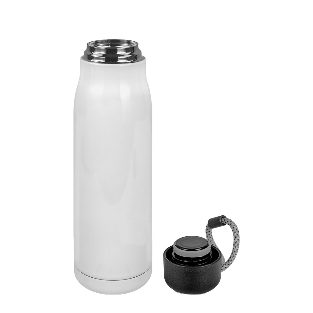 Garrafa de parede dupla com 550 ml de capacidade com alça para fácil transporte, especial para sublimação. Não use para bebidas carbonatadas ou aquelas que são ácidas.