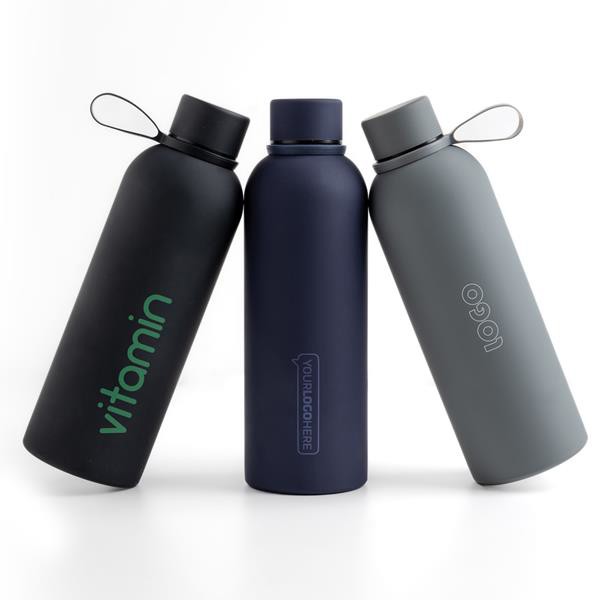 Garrafa térmica de 500 ml com acabamento em borracha. Fabricada em aço inoxidável com parede dupla, esta garrafa é a escolha perfeita para todas as estações do ano, quer seja Verão ou Inverno. Graças ao seu design, mantém a temperatura dos líquidos durante várias horas, assegurando a sua comodidade. O acabamento com toque de borracha confere-lhe um aspeto sofisticado e proporciona uma sensação confortável ao toque.