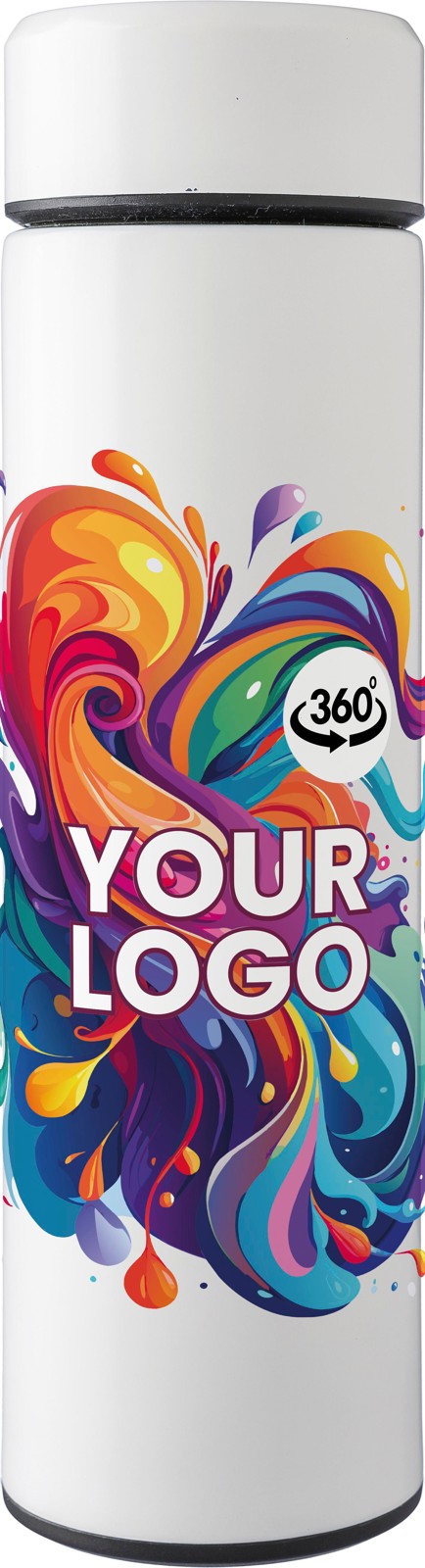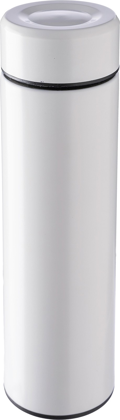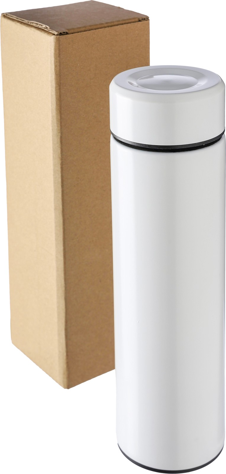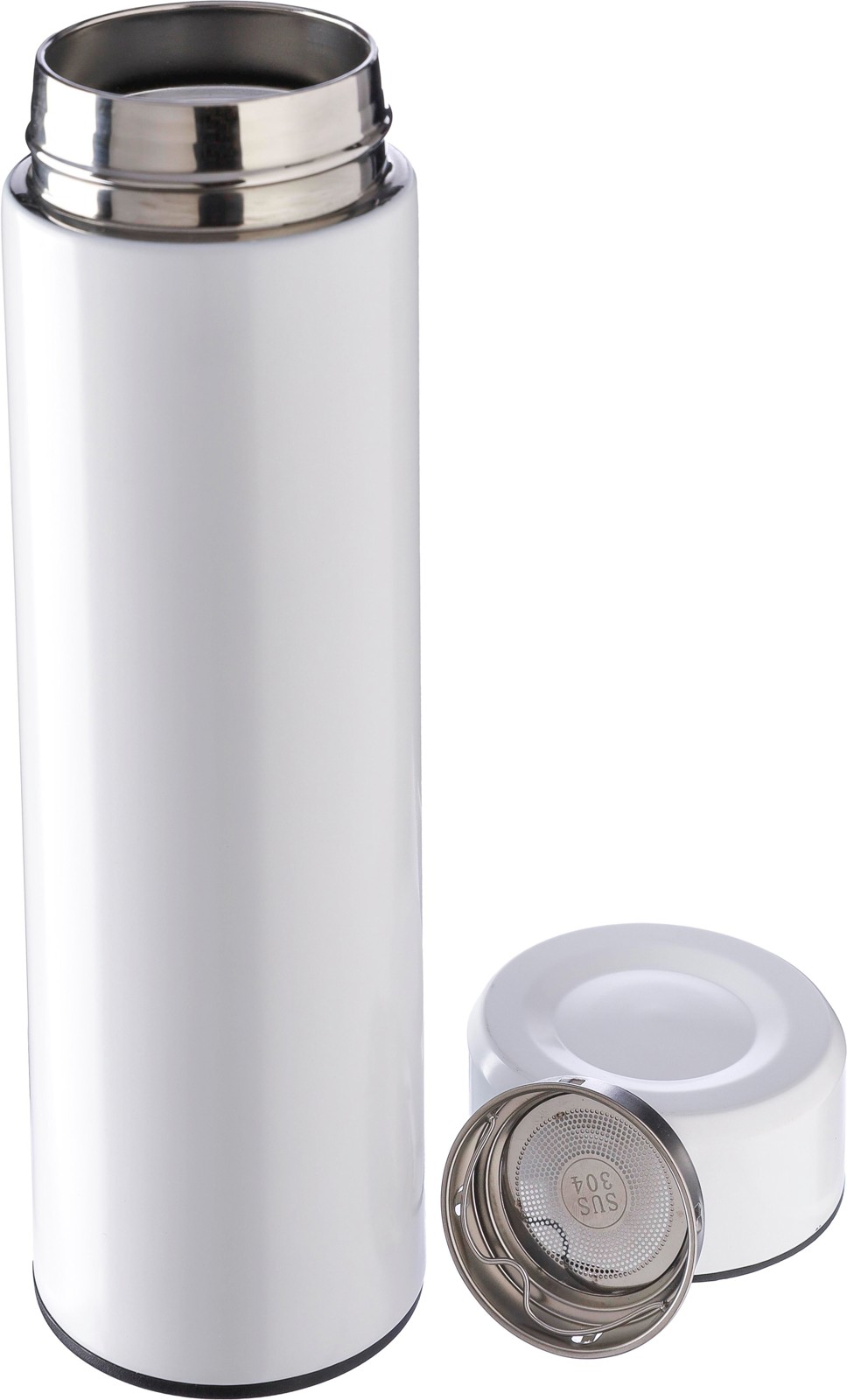 Garrafa térmica de aço inoxidável de parede dupla (425 ml) com um coador de chá incorporado e removível. O interior é feito de aço inoxidável 304 e o exterior é de aço inoxidável 201. Apresentada individualmente numa caixa de cartão castanha.