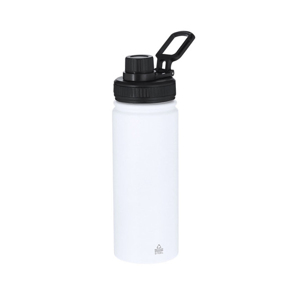 Garrafa de Aço Inox Reciclado com 550 ml de capacidade. Inclui tampa colorida preta com sistema de fechamento com rosca, agarre de silicone para um ótimo selamento, dosificador e alça para transporte ajustável. Em acabamento fosco especialmente desenhado para laser. Inclui distintivo Aço Inox Reciclado.O aço é um dos materiais mais demandados e pode ser encontrado quase em todos os lugares, desde produtos de uso diário até grandes construções. Com inúmeras propriedades, entre as quais se destaca a durabilidade e seu alto grau de reutilização, tornando-se uma alternativa muito valorizada em soluções de sustentabilidade. Devidamente tratado, permite obter novos recursos de infinita utilização. 550 ml