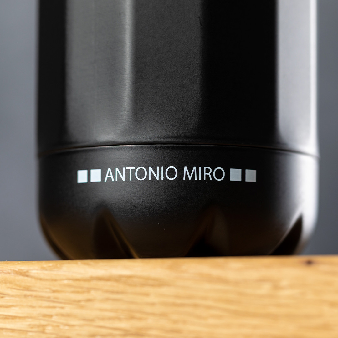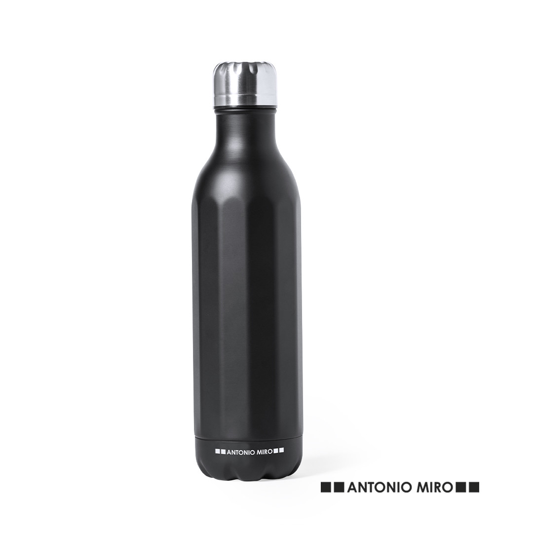 Garrafa em aço inoxidável Antonio Miró. De 750ml de capacidade e acabamento preto acetinado sóbrio, com corpo em prisma e logótipo da marca na base. Com tampa de rosca cromada e apresentada numa atrativa caixa de design com logótipo da marca. 750 ml