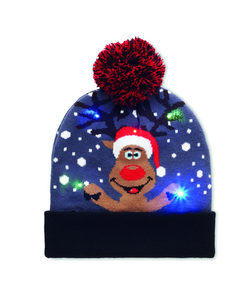 Gorro de Natal tricotado com 6 luzes LED (3 luzes de regulação), com punho e gola em acrílico macio e extensível. 1 pilha CR2032 incluída.