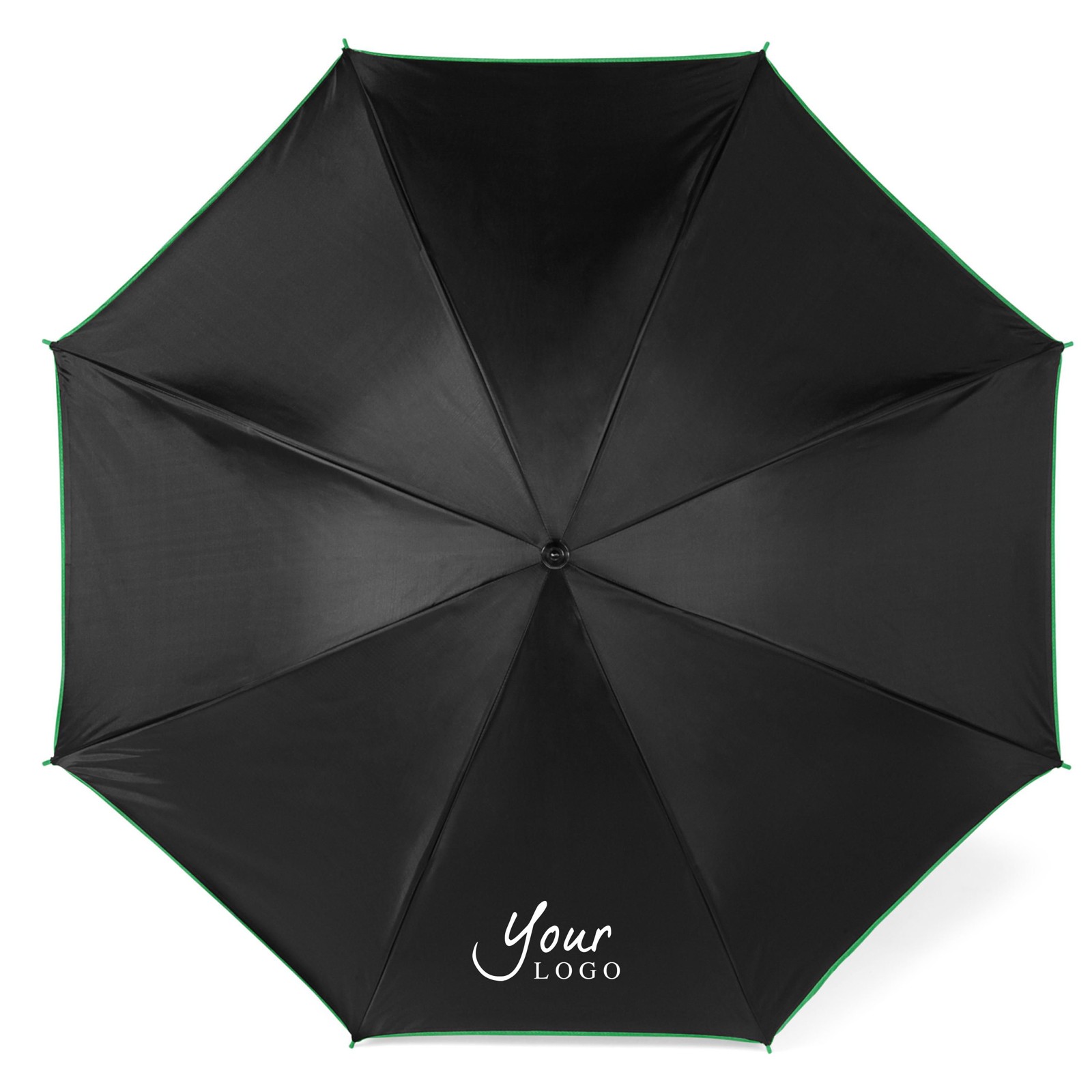 Guarda-chuva automático de poliéster 190T, punho curvo de plástico, cabo e varetas de metal, fecho em velcro.