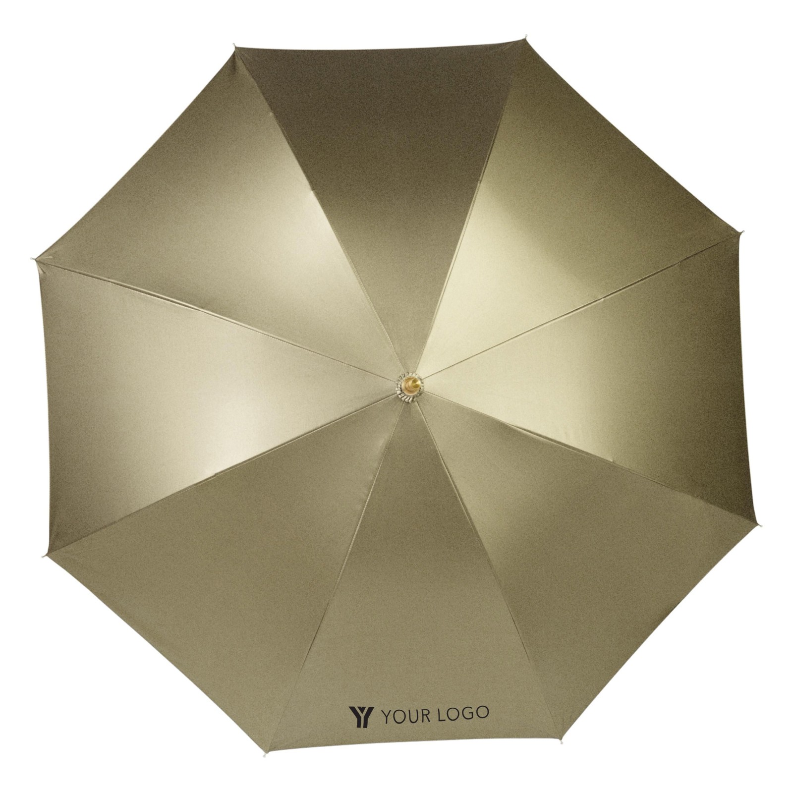 Guarda-chuva automático com 8 painéis de poliéster pongee com cabo, punho e varetas de metal e fecho de velcro.
