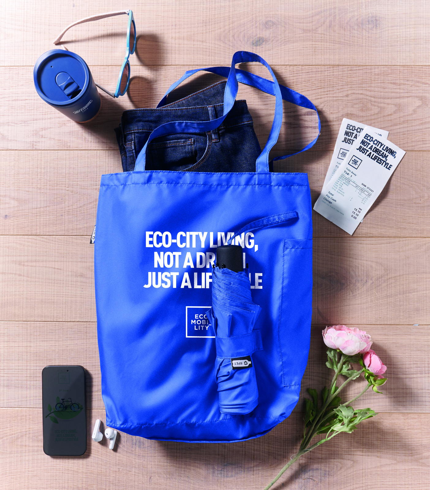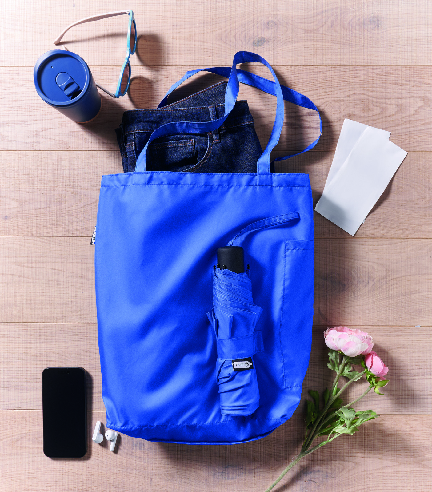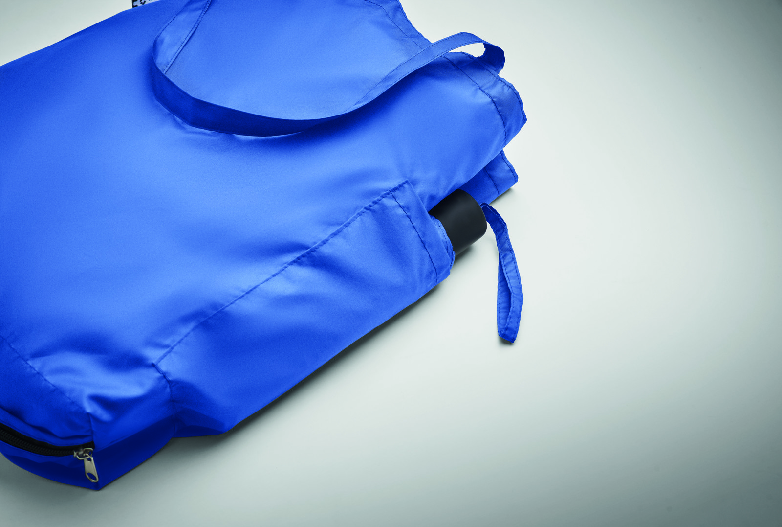 Guarda-chuva à prova de vento de 21 polegadas com 3 dobras, abertura e fechamento manual, em pongee RPET 190T. Inclui sacola de compras. Possui um compartimento oculto com zíper para guardar o guarda-chuva e manter seco o conteúdo da bolsa. Quando a bolsa não está em uso, ela enrola e o compartimento com zíper funciona como capa de guarda-chuva.