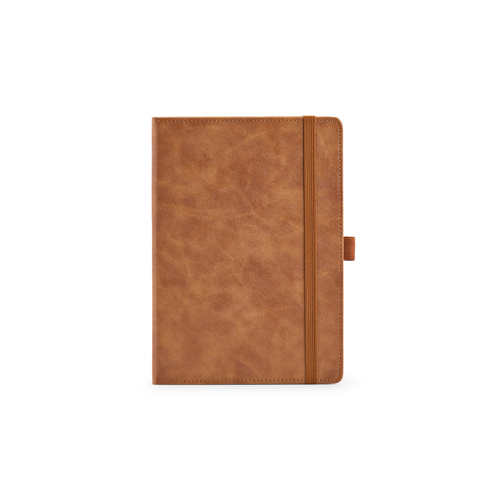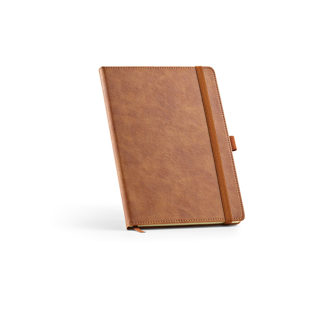 Caderno Howthorne A5, com capa em PU reciclado, contém 196 páginas lisas FSC® de 70 gsm, com espaço para data e número de página - onde a criatividade encontra a funcionalidade. Inclui um elástico vertical, suporte para esferográfica e fita marcadora a condizer. Fornecido numa manga individual de kraft.