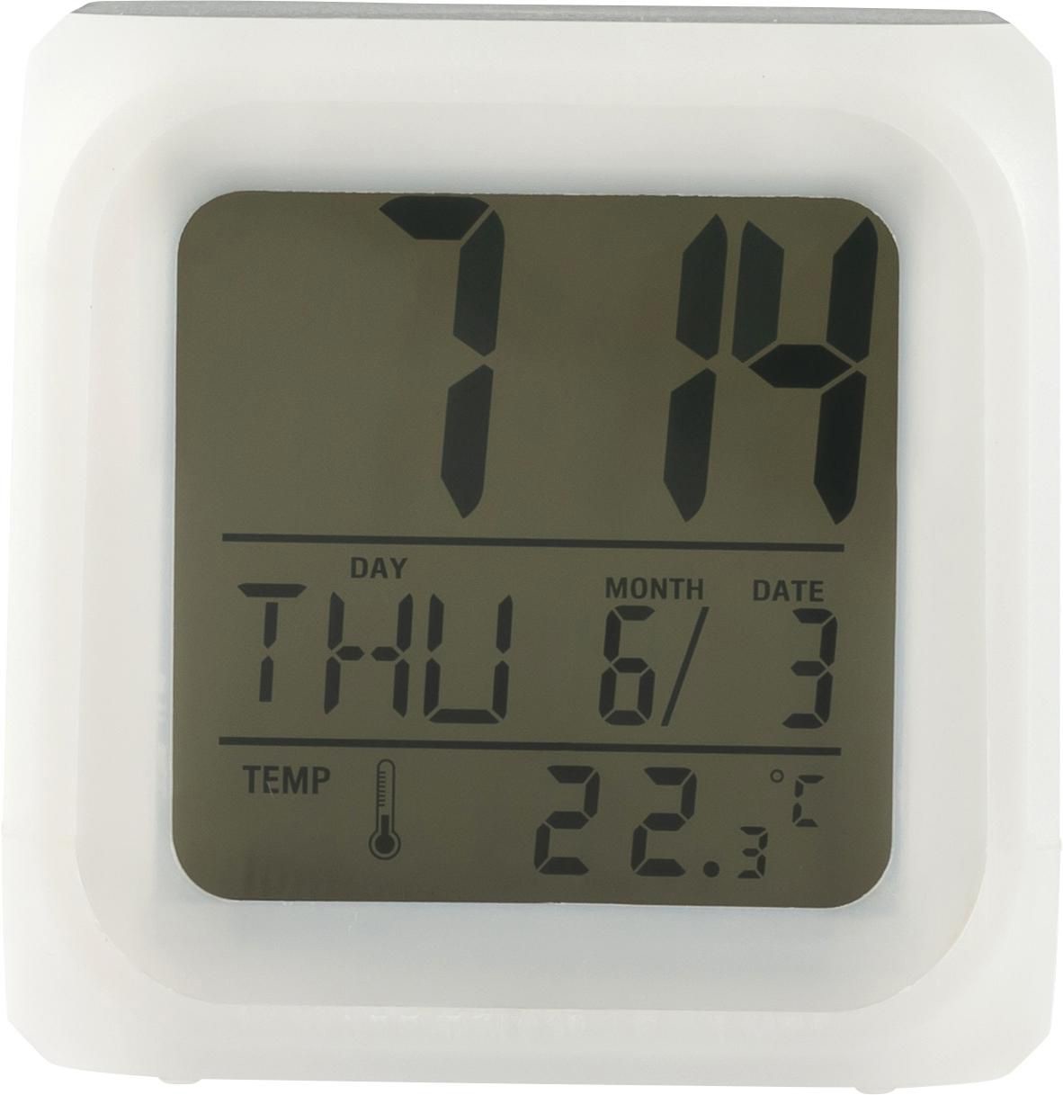 Despertador HIPS em forma de cubo que muda de cor. Exibe a hora, dia da semana, data e temperatura. Pilhas incluídas.