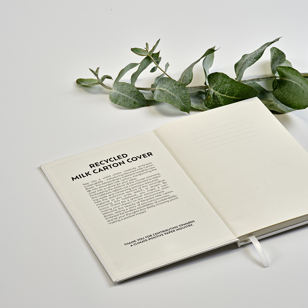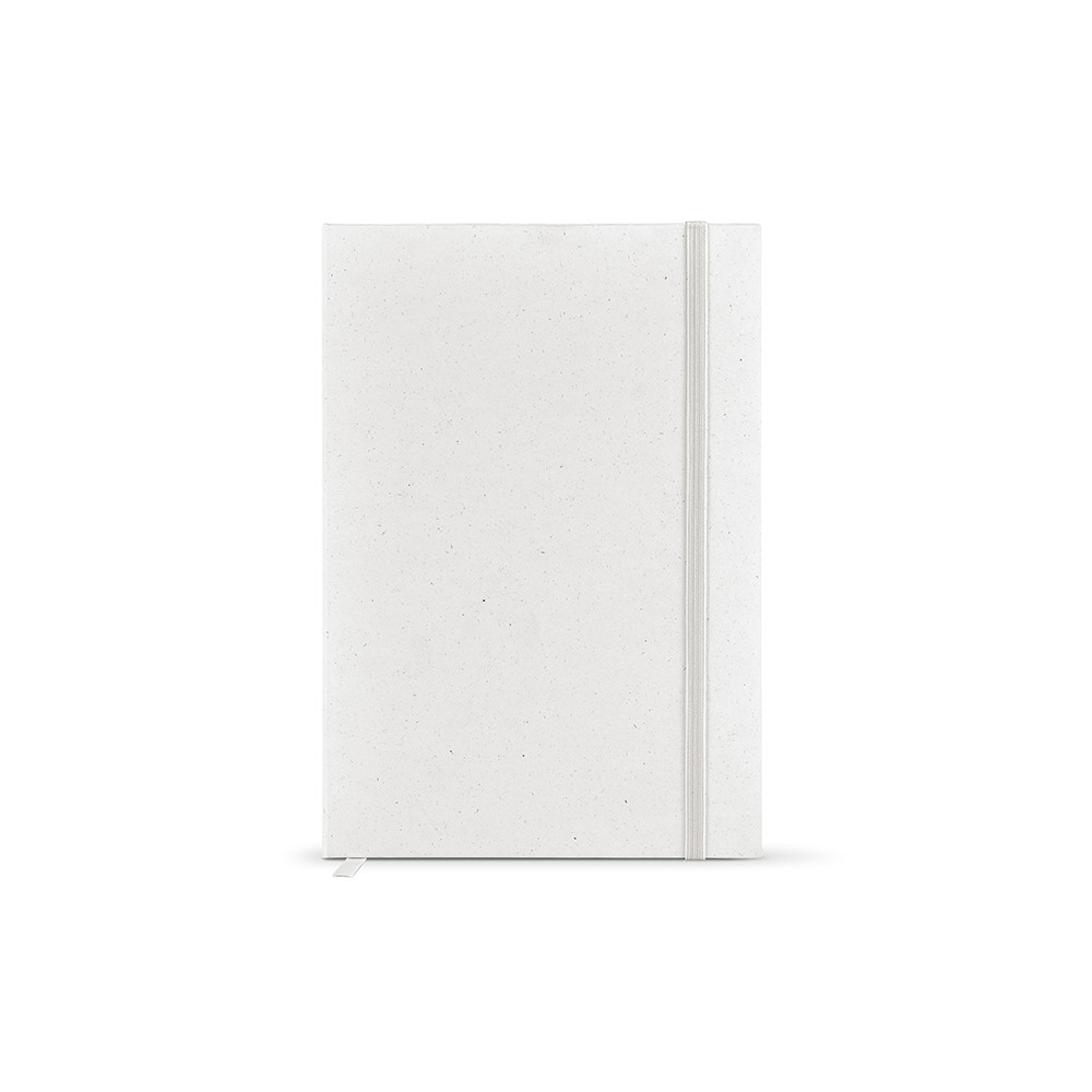 O caderno Hugo A5, com capa rigída feita de embalagens de leite recicladas. Inclui 160 páginas FSC® pontilhadas recicladas (70 gsm), com espaço para data e número de página, elástico de fecho e fita marcadora. Dê asas à criatividade sustentável! Fornecido numa manga individual de kraft.
