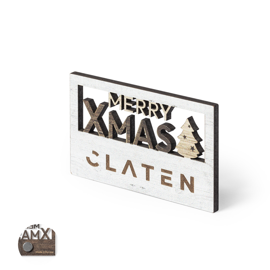 Original íman Merry Christmas fabricado em madeira natural, com texto recortado e de original acabamento bicolor. Ampla superfície de impressão e distintivo Made In Europe.