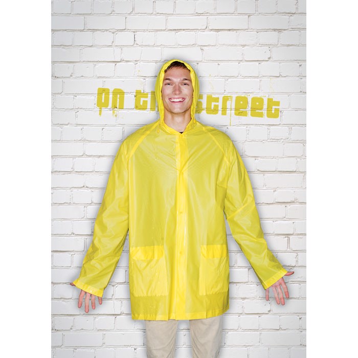 Impermeável de PVC com capuz e bolsos.