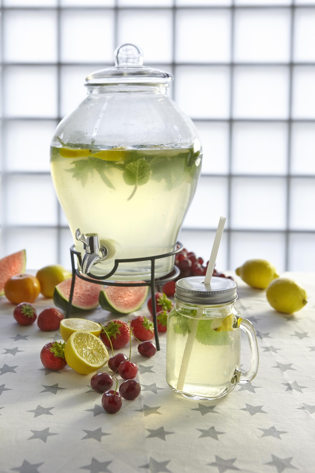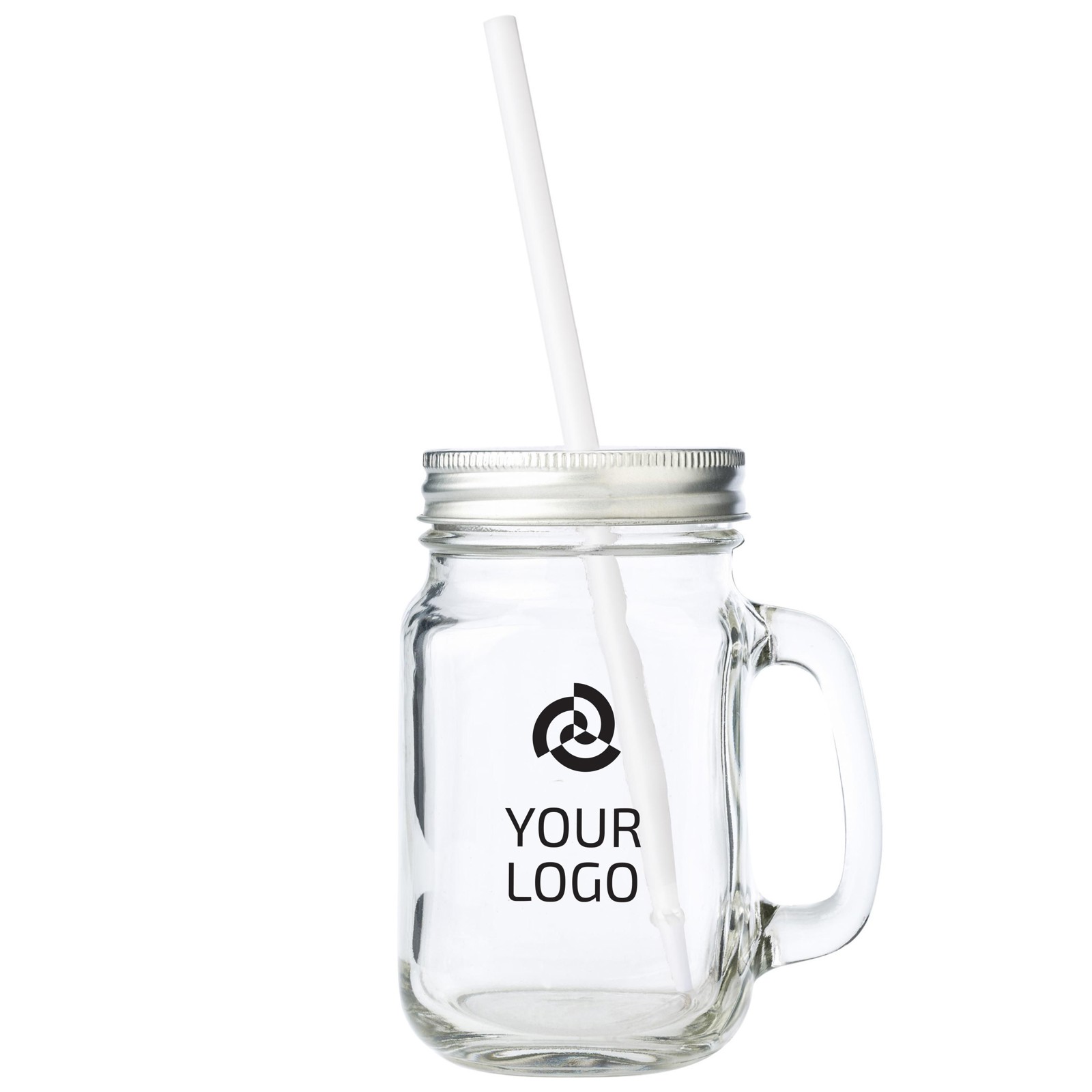Jarra em vidro para beber (480 ml) com alça e tampa em cor prateado. Inclui um buraco no meio para colocar a palhinha de plástico. Venda em múltiplo de 32 unidades.
