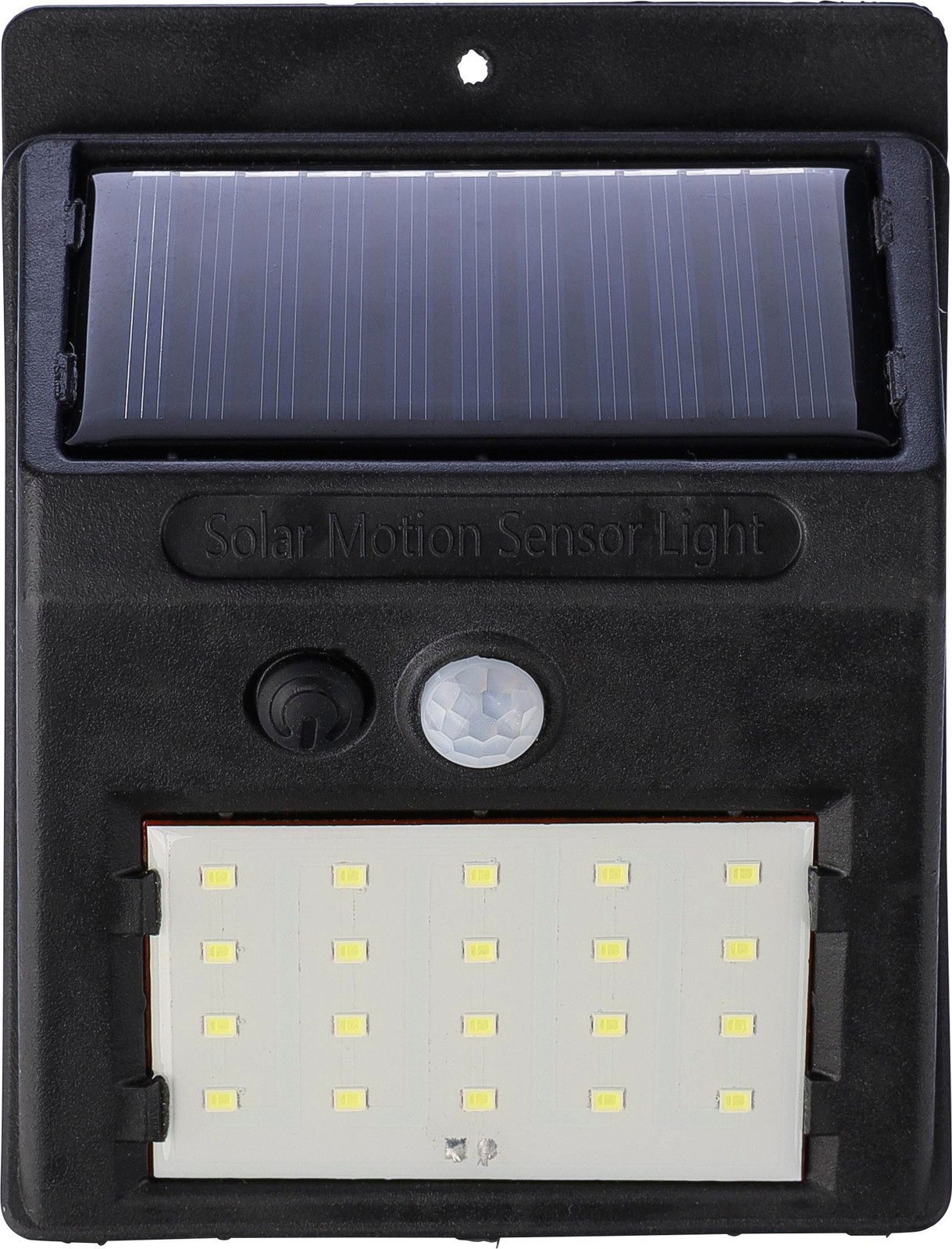 Lâmpada solar PP com LED 20-COB. Dispõe de um sensor noturno (CDS) e de um sensor de movimento (PIR). Inclui uma bateria com capacidade de 800 mAh, um cabo de carregamento, classificação IP44 e funções de luz constante ou intermitente. Embalado individualmente numa caixa de cartão castanha.