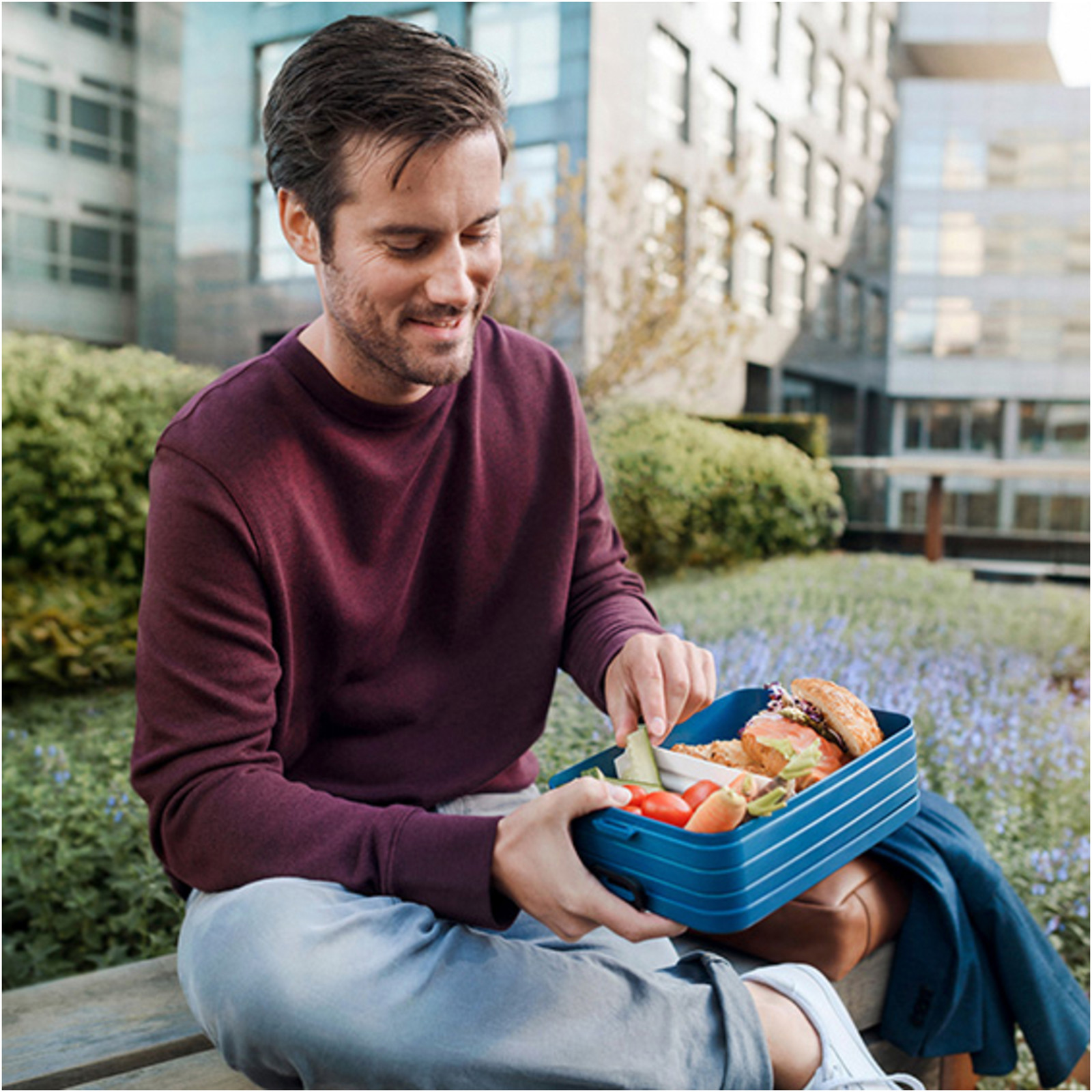 Lancheira com um anel de vedação justo para manter o conteúdo fresco e saboroso. Adequado para 8 sanduíches. Divisória incluída. A capacidade é de 1,5 litros. Pode ir à máquina de lavar. Sem BPA.