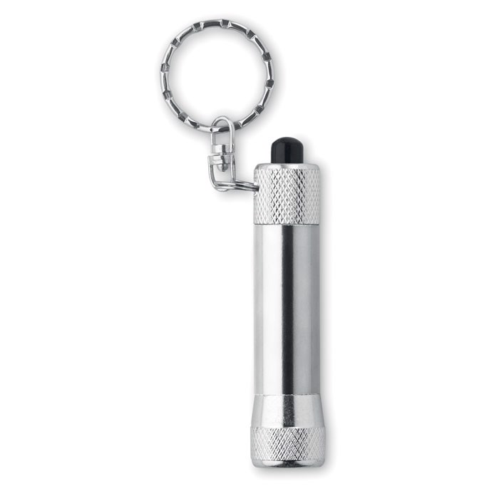 Mini-lanterna de alumínio com 1 LED e porta-chaves com 4 baterias LR44 incluídas.