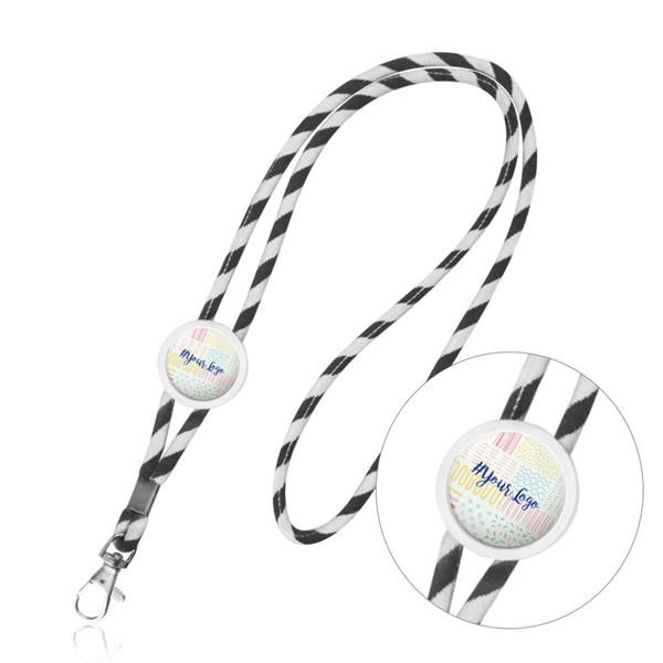 Lanyard tubular em terylene, ajustável e mosquetão. Lanyard com um padrão de riscas largas que variam em combinação entre o branco e outras cores. O ajustável em plástico foi especialmente desenhado para personalização através de resina. Adicione o seu logotipo, slogan ou design exclusivo para criar uma peça única que reflete a identidade da sua marca. Para tornar a personalização mais fácil, pode adquirir a nossa resina 370487, criada especialmente para este ajustável.