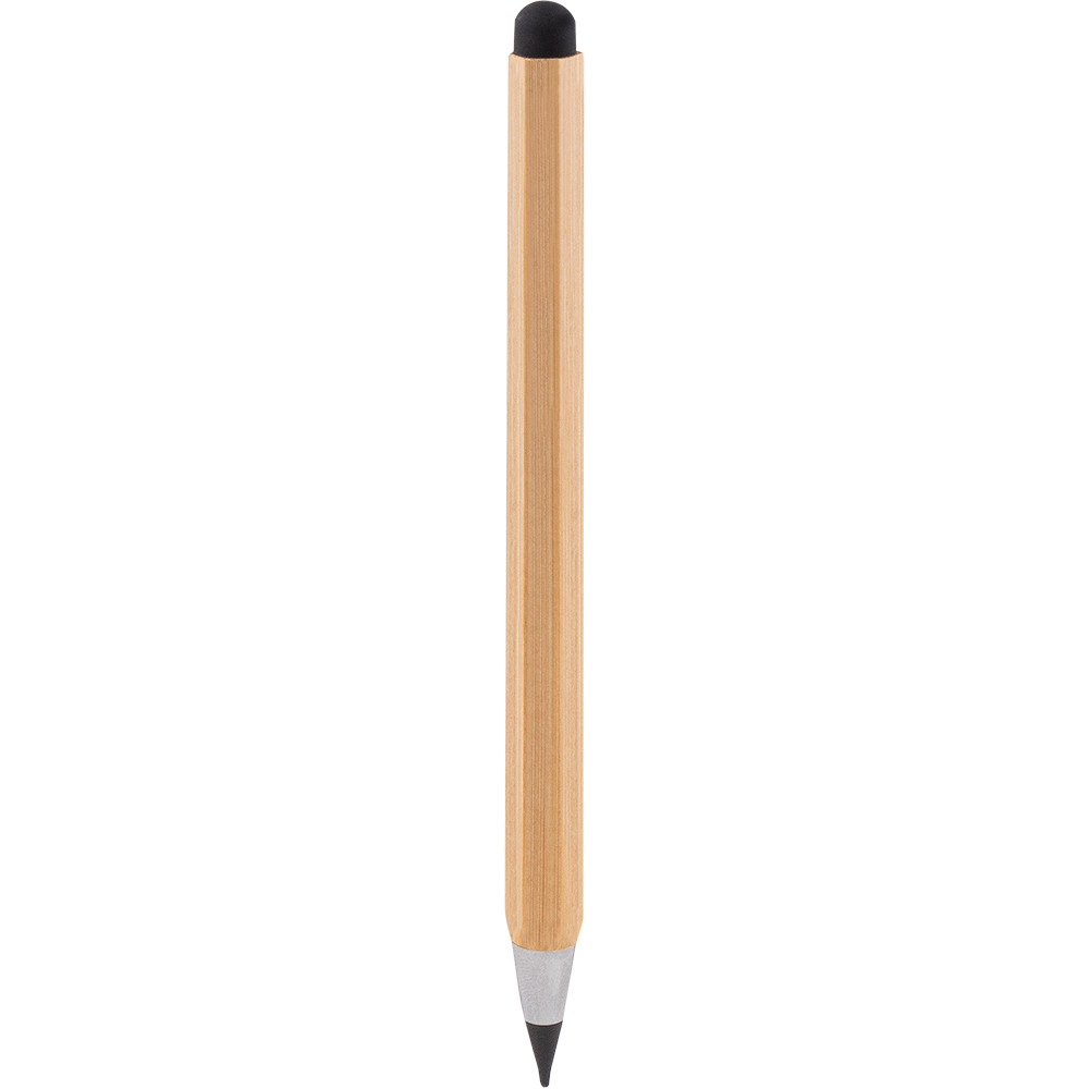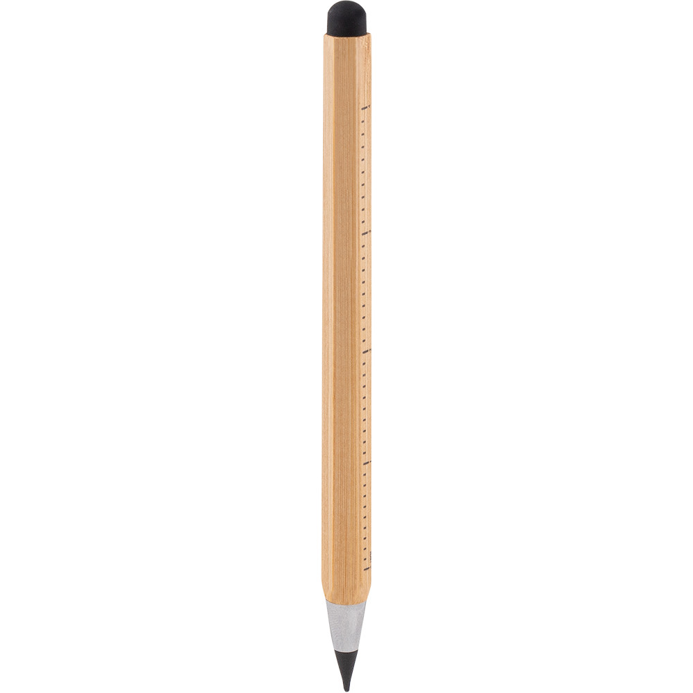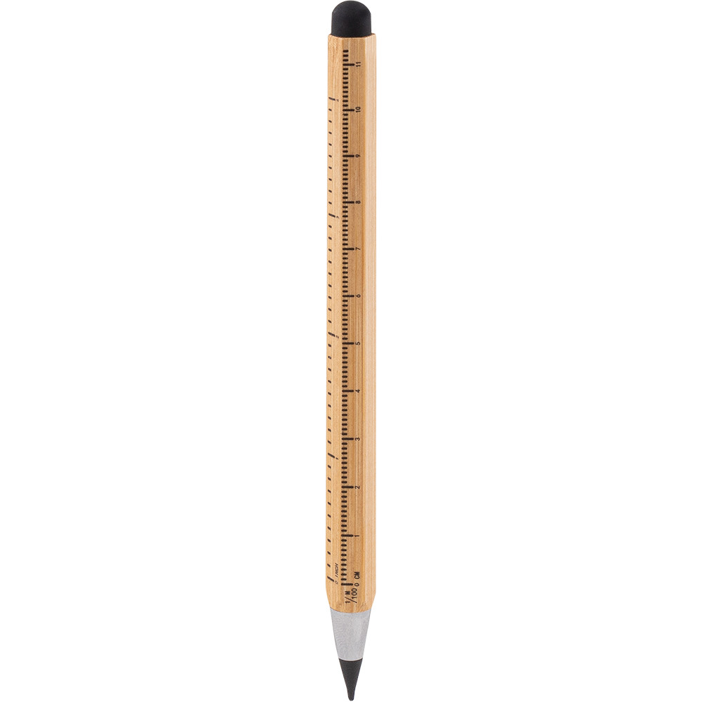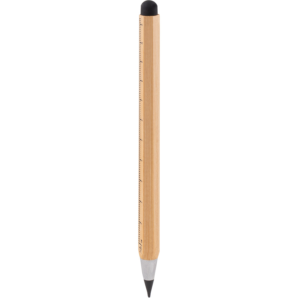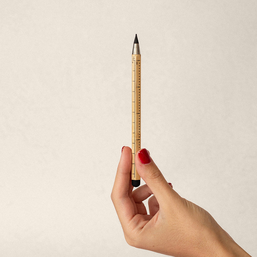 Lápis infinito multifuncional fabricada em bambu com formato hexagonal. Função de régua com medidas em centímetros e polegadas.