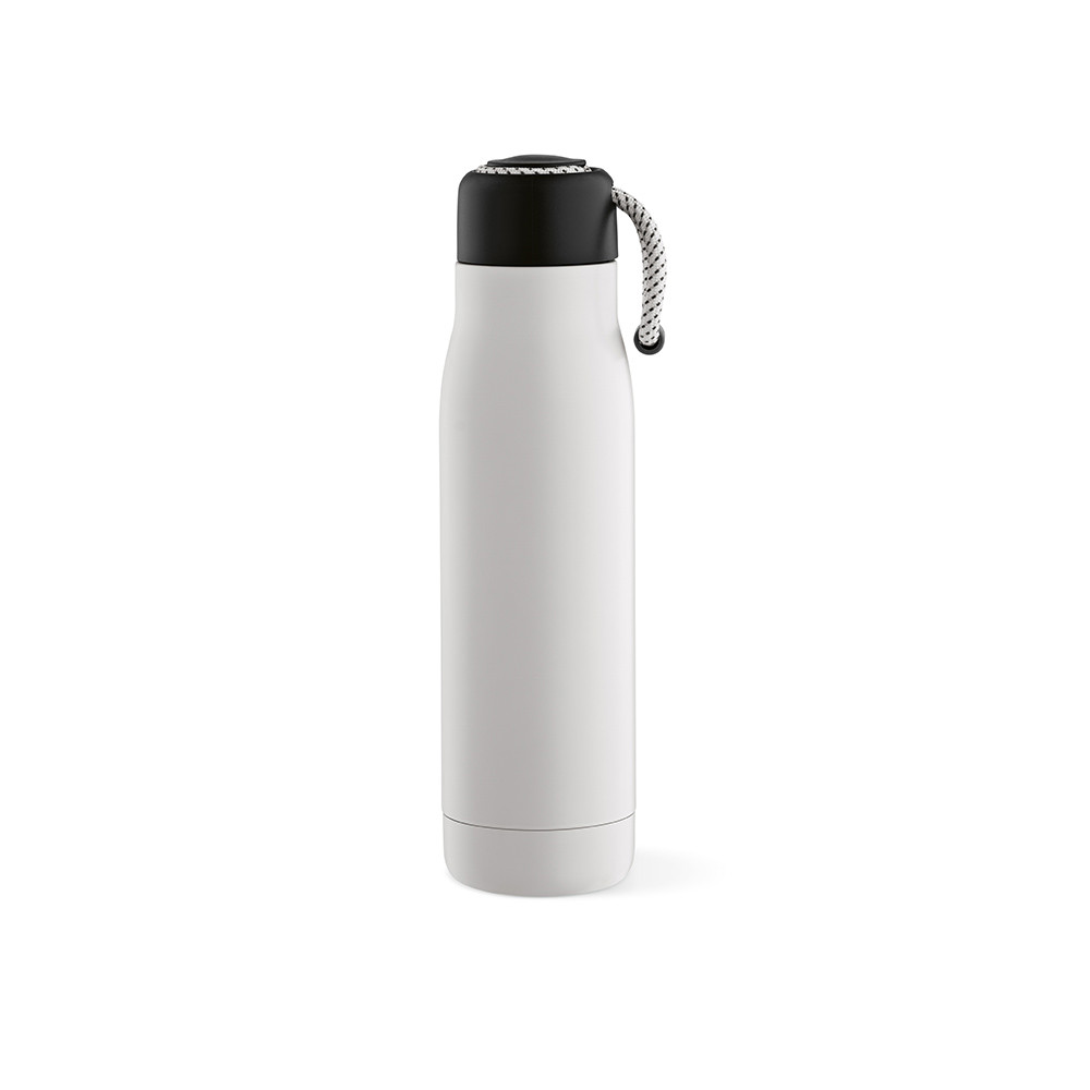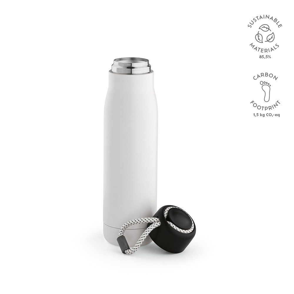 A garrafa Lena tem 570ml de capacidade (540ml líquidos) e é fabricada em aço inoxidável reciclado. O isolamento a vácuo com parede dupla mantém a bebida quente durante 14 horas e fria durante 48 horas. À prova de fugas e com alça de transporte em rPET. Embalada numa caixa de kraft individual.