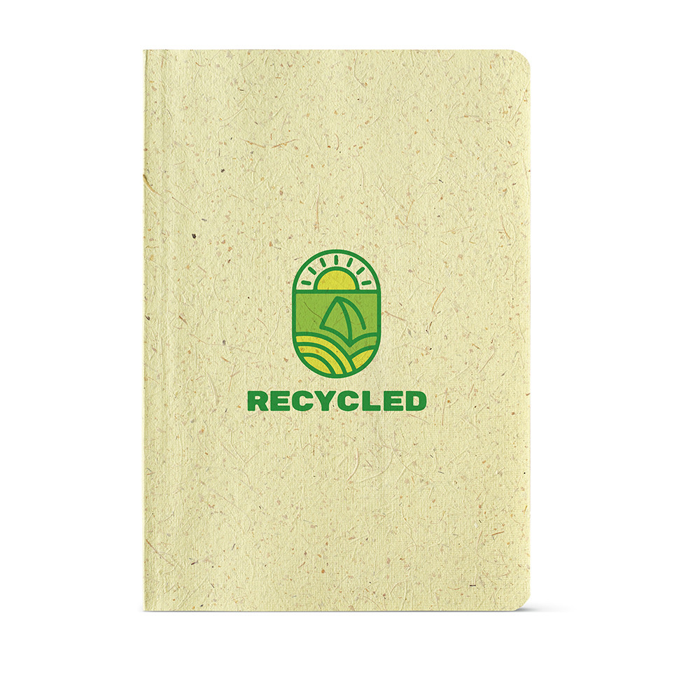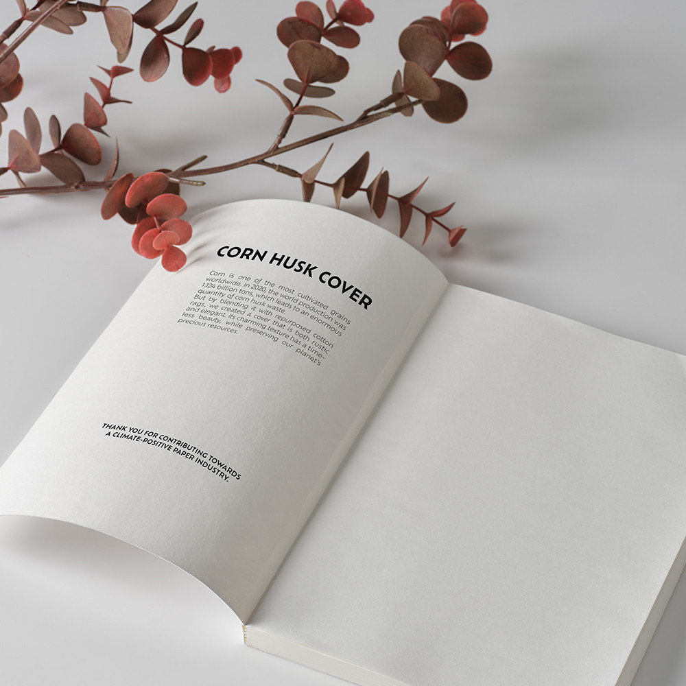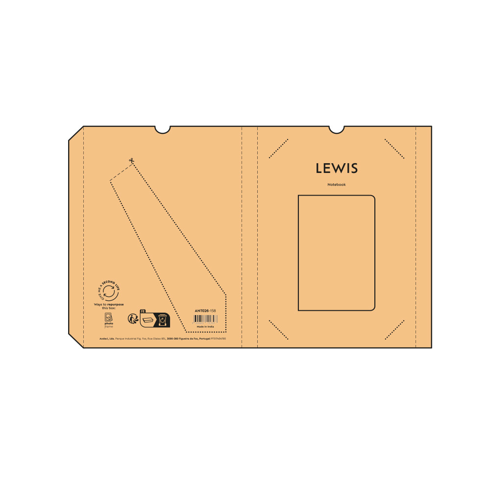 Caderno Lewis A5, com capa de casca de milho (60% casca de milho e 40% pano de algodão), contém 196 páginas recicladas pontilhadas (80 gsm), com espaço para data e número de página. A capa flexível e a folha de rosto despertam a criatividade, com impacto positivo. Fornecido numa manga individual de kraft.