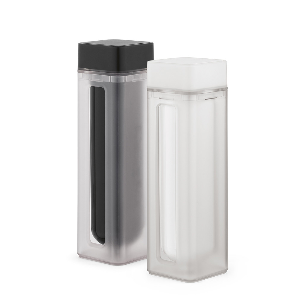 A Lucen tem capacidade de 540 ml (500 ml líquidos) e é fabricada com plástico reciclado de injeção dupla (ABS e PBT). Possui um design exclusivo de rotação e bloqueio. A garrafa interior pode ser personalizada com impressão digital UV 360º em cores vivas, com o logótipo em destaque. Fornecida em caixa kraft individual.