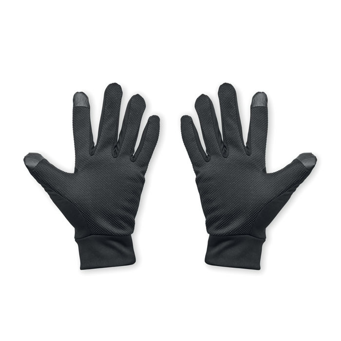 Luvas desportivas tácteis para smartphone em poliéster. Dois dedos com função táctil com pontos antiderrapantes na palma e nos dedos em PVC.