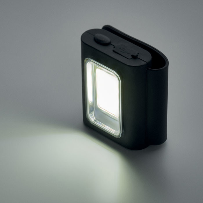 Mini lanterna portátil COB recarregável USB 400 mAh. Fluxo luminoso: 150. 6 modos de iluminação. Inclui clipe de silicone e fecho magnético.
