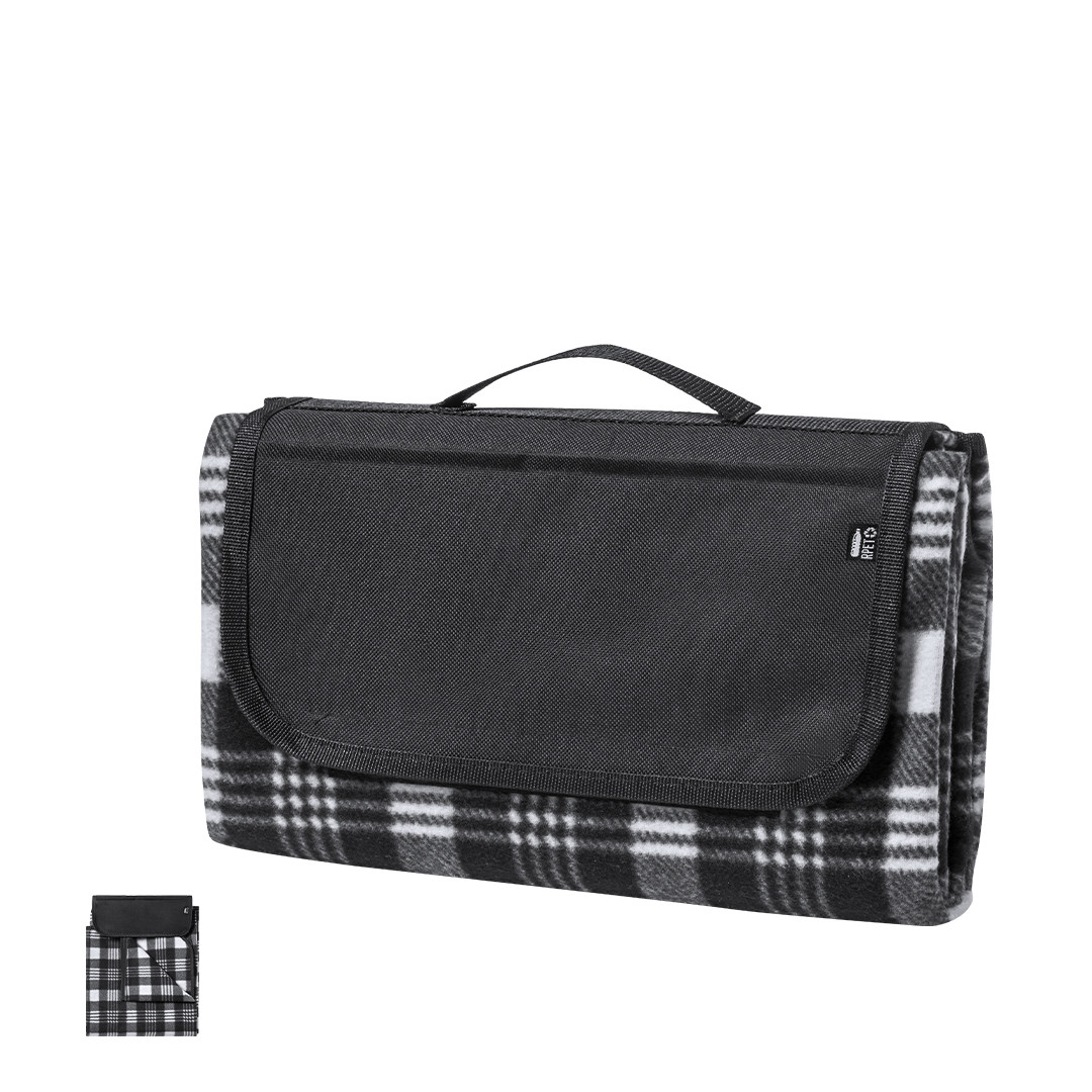 Manta de picnic de qualidade premium, fabricada em poliéster RPET de 160g/m2, elaborada a partir de plástico reciclado para promover a reutilização de resíduos plásticos e contribuir para a sustentabilidade do planeta. Medidas 120x150cm, com lado para se sentar em padrão tartán bicolor de suave tato. Lado em contacto com o solo em resistente PEVA. Fácil de dobrar e de tamanho compacto, inclui alça de transporte e aba com fecho de velcro, com distintivo RPET na etiqueta.