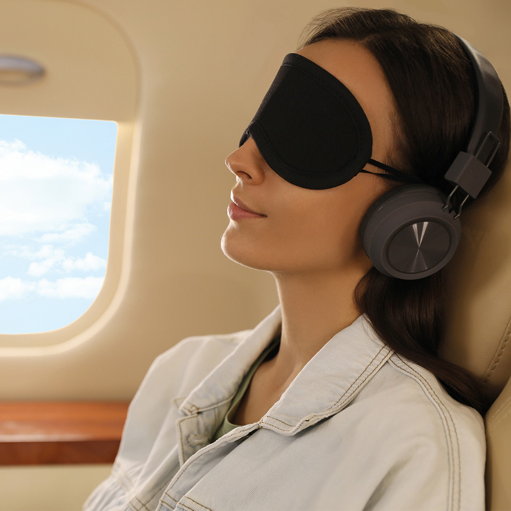 Máscara de olhos fabricada em poliester. Ideal para descansar nas suas viagens. Amplia zona de impressão.