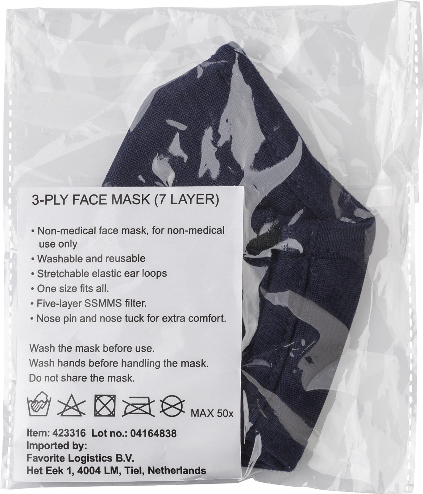 Máscara reutilizável de algodão. Polybag individual, caixas de 50 unidades. Cintas elásticas e ajuste nasal. 7 camadas (5 camadas internas do filtro SSMMS Melt Blown) e filtração bacteriana de 95%. Lavável a 60 graus (máx. 50 lavagens). Não uso sanitário