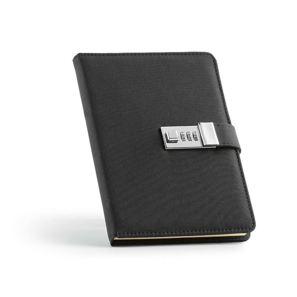 Caderno Melville A5 é um bloco com cadeado, com capa em 300D rPET. Inclui um caderno removível com 192 páginas FSC® de papel liso marfim (70 g/m²), com espaço reservado para data e número da página. Dispõe de dois bolsos interiores para melhor organização.
