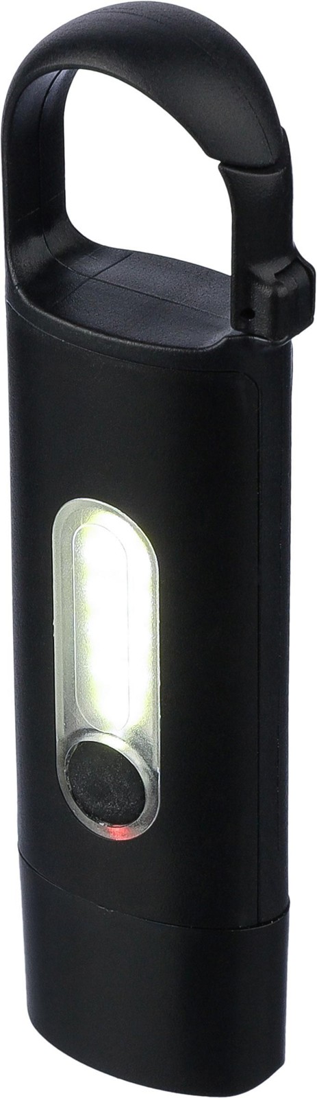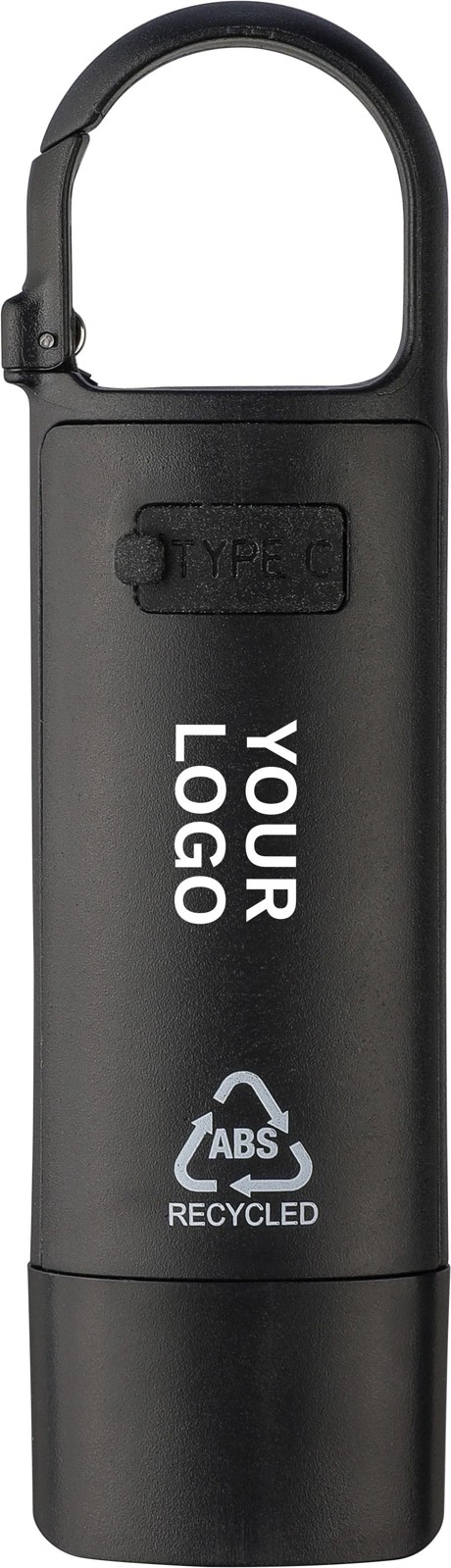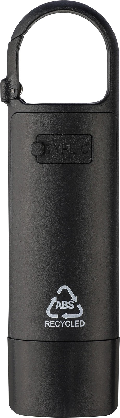 Mini lanterna em ABS reciclado com bateria recarregável por USB de 200 mAh incorporada e mosquetão. Inclui uma luz COB frontal e um projetor COB lateral com três modos de iluminação. Inclui cabo de carregamento USB-C e logótipo em ABS reciclado. Embalada individualmente numa caixa de cartão castanha.