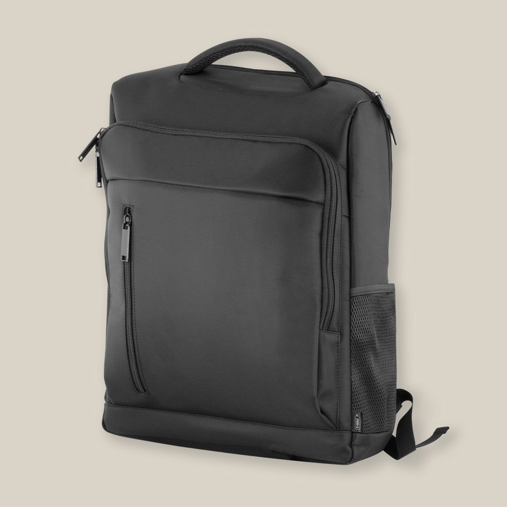 Mochila de congressos fabricada em poliéster com acabamento impermeável. Acolchoada no interior, exterior e traseira. Bolso anti-roubo com proteção RFID na parte traseira. Faixa para trolley.