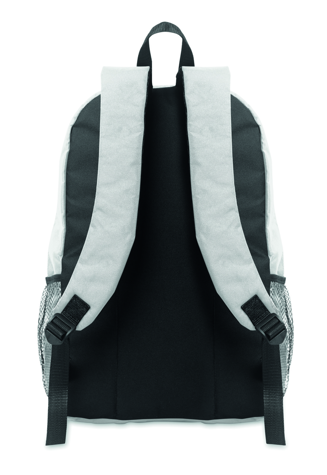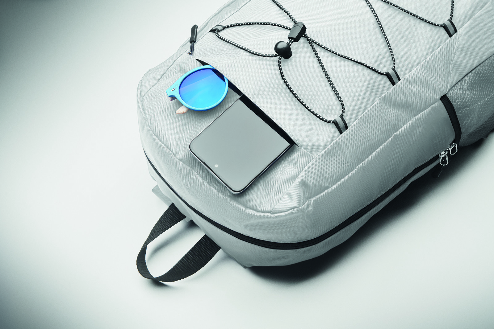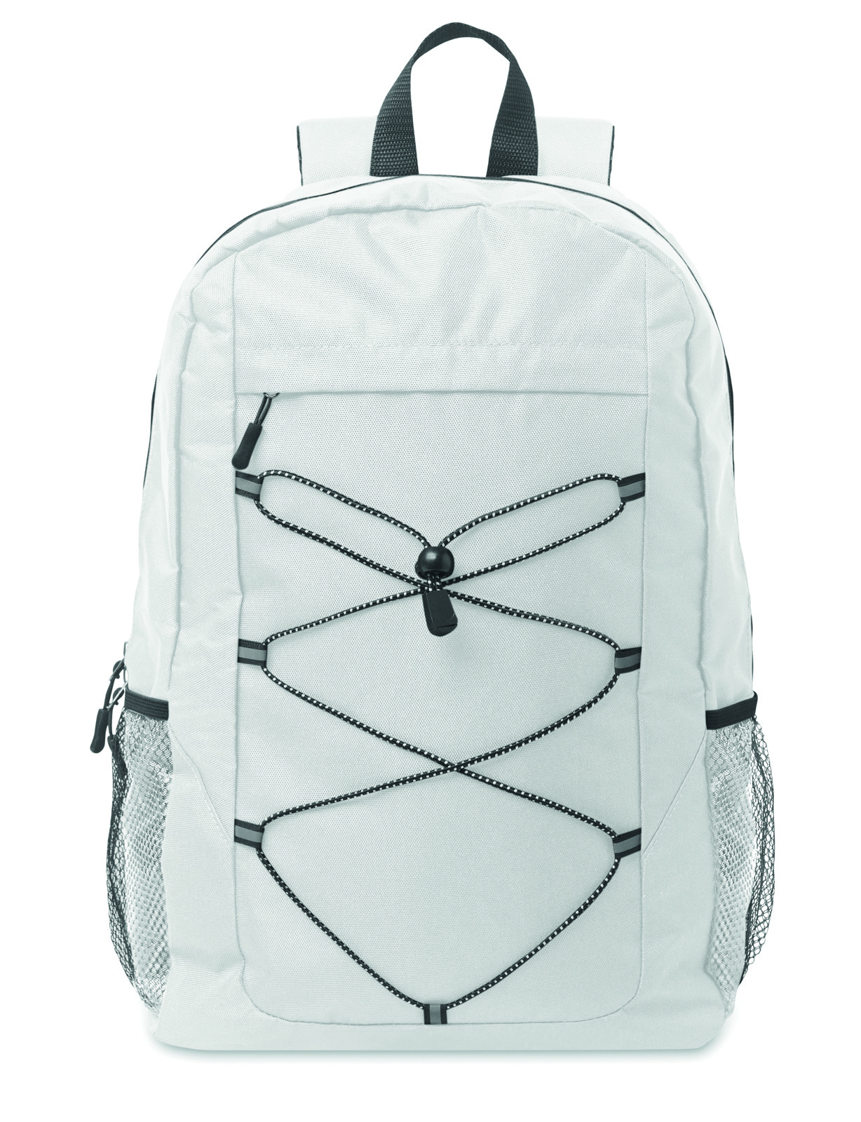 Mochila em poliéster 600D RPET com cordão decorativo e painel de bolsos com fecho de correr à frente. Bolsos de rede em ambos os lados.