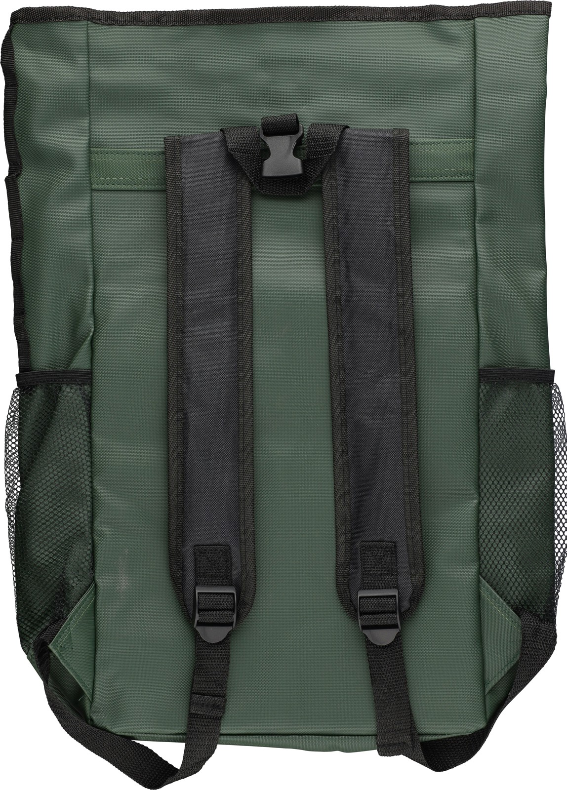 Mochila com tampa de em poliéster rPET (600D) com revestimento em PU para repelir a água. Inclui um bolso frontal oculto com fecho de correr, uma bolsa almofadada para computador portátil (compatível com computadores portáteis até 15 polegadas), bolsos laterais em rede e um total de cinco compartimentos, incluindo bolsos interiores e frontais. Concebida com alças de transporte ajustáveis e Oferece uma capacidade de 25 litros e uma capacidade de transporte de 15 kg. Inclui uma etiqueta rPET na parte lateral e uma etiqueta personalizada no interior.