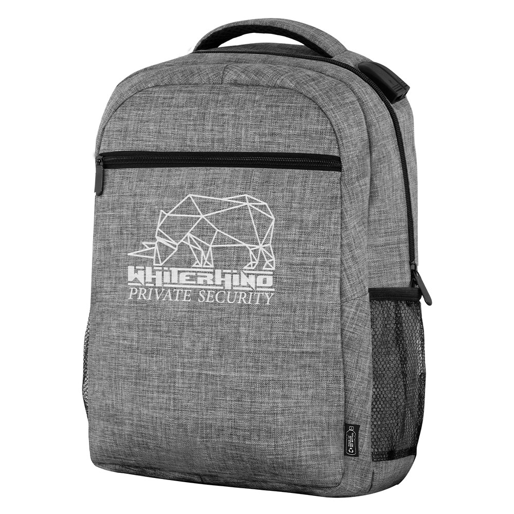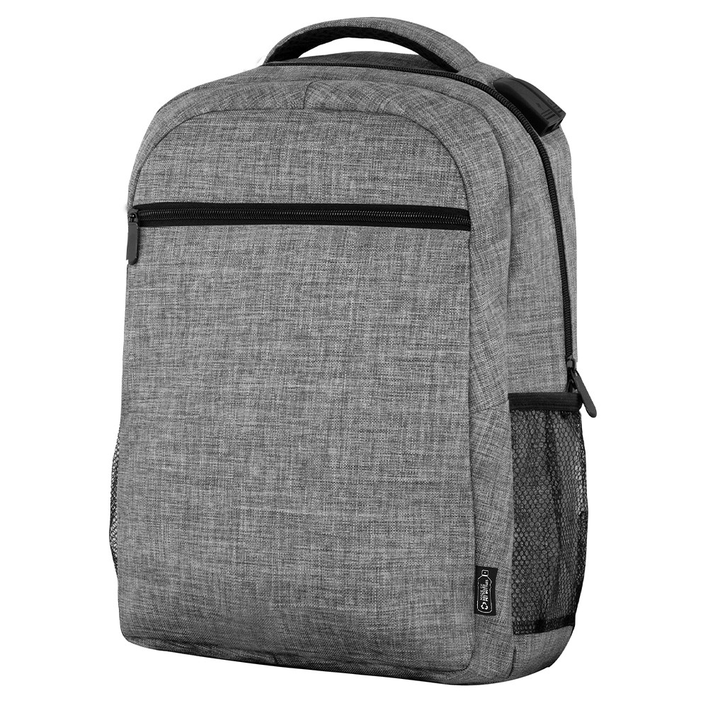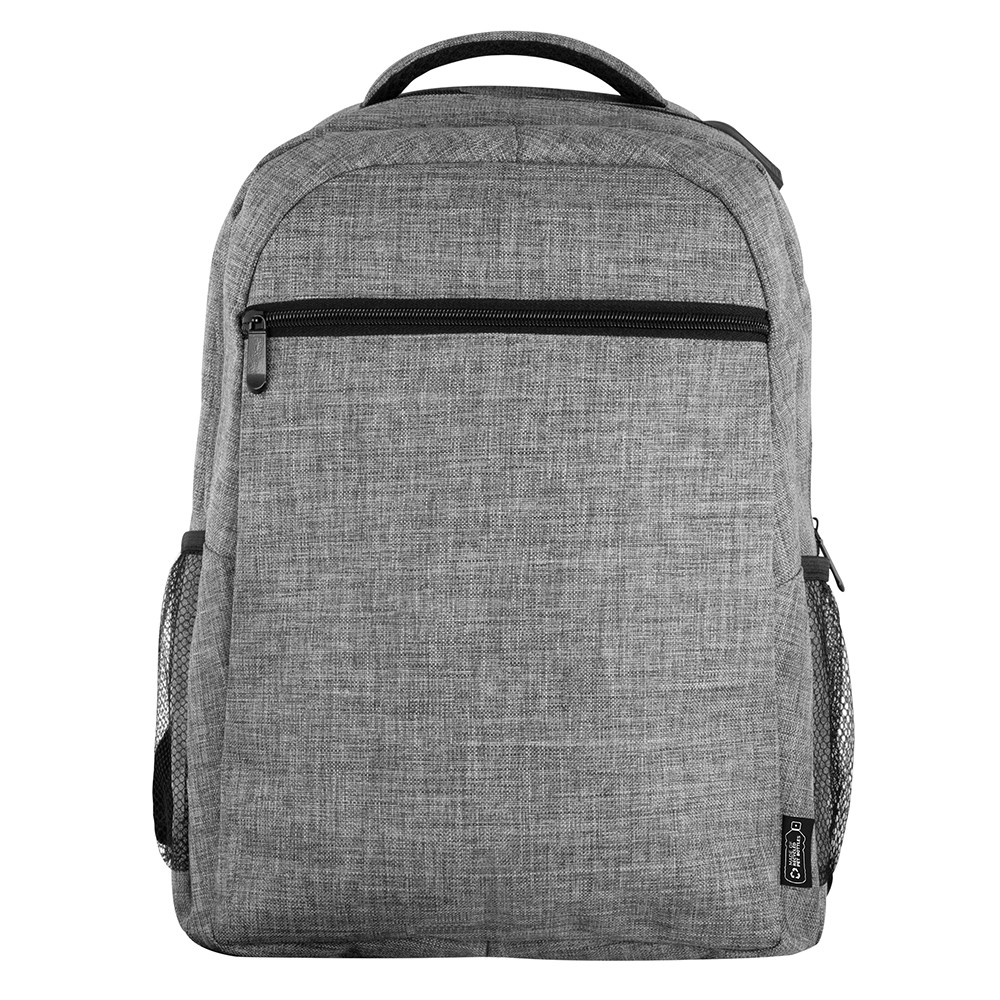 Mochila para congressos fabricada em RPET two tone acabamento denim. Interior acolchoado para laptop, saída USB para powerbank (não incluído) e saída de áudio 3.5.