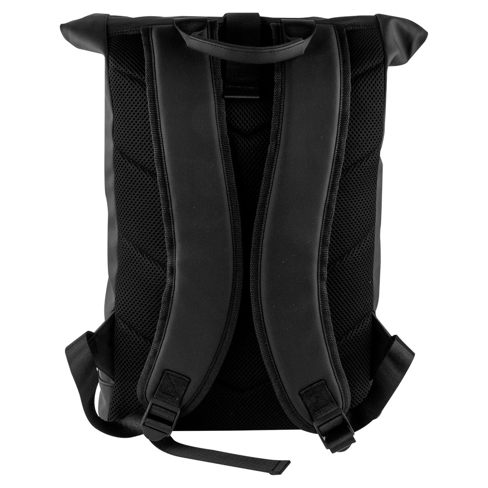 Mochila roll-top com compartimento para laptop de 15". Acabamento emborrachado suave. Detalhe refletivo no zíper externo.