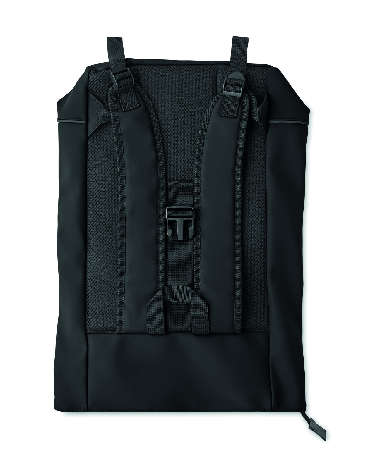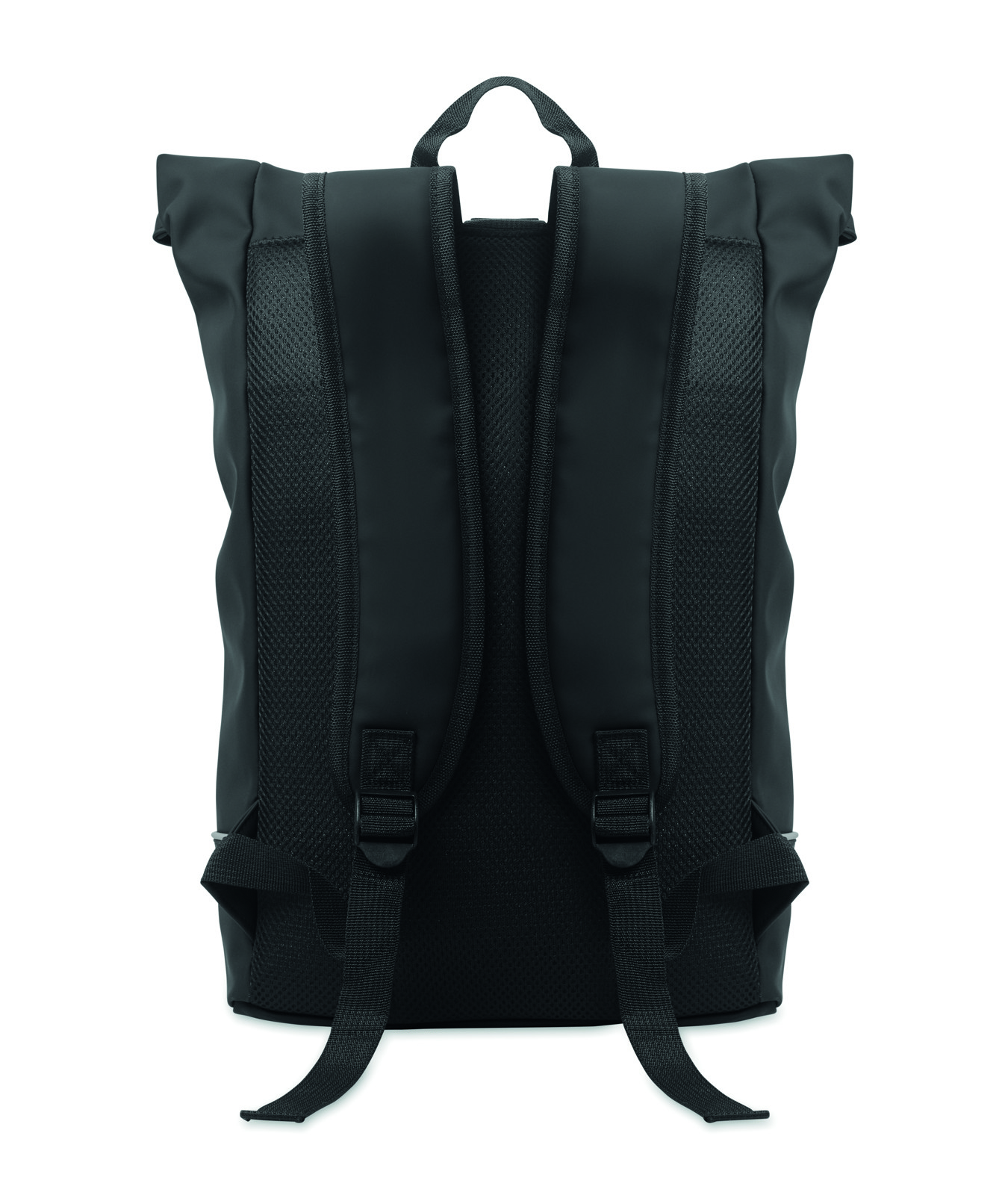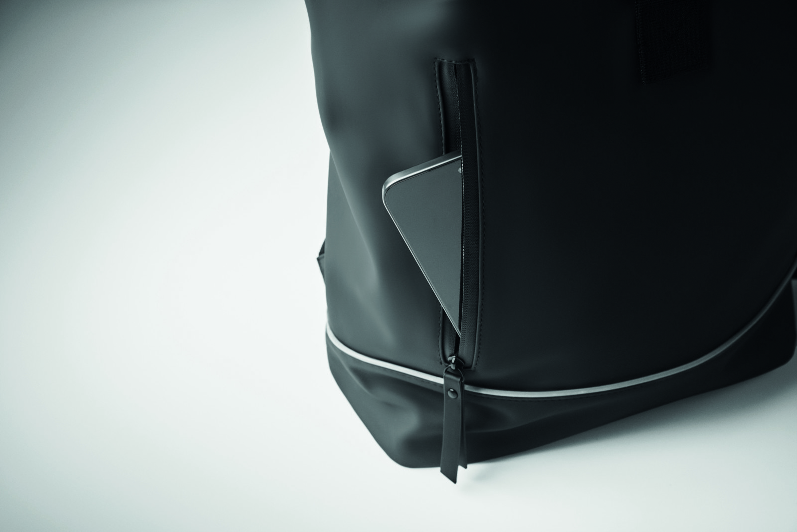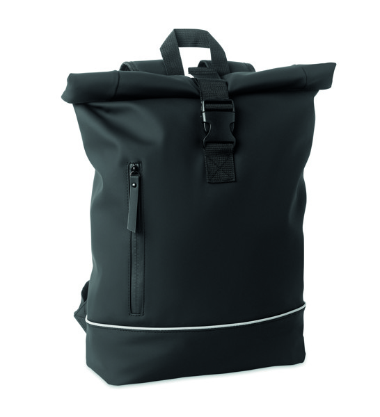 Mochila rolltop para computador portátil de 15 polegadas em PU macio com costas almofadadas e reforço da base com fita reflectora. Bolso frontal impermeável com fecho de correr. forro em poliéster 210D RPET.