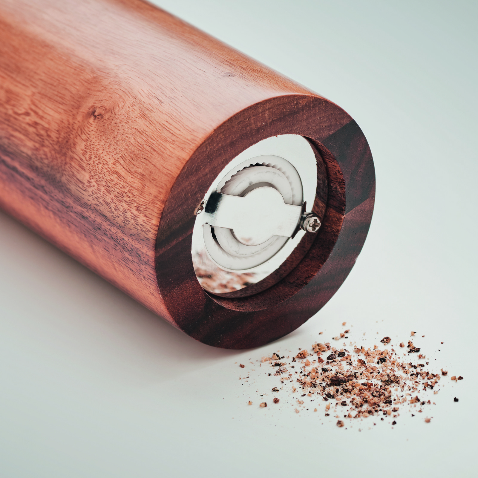 Moinho de pimenta feito de madeira de acácia. Mecanismo em aço inoxidável e cerâmica.