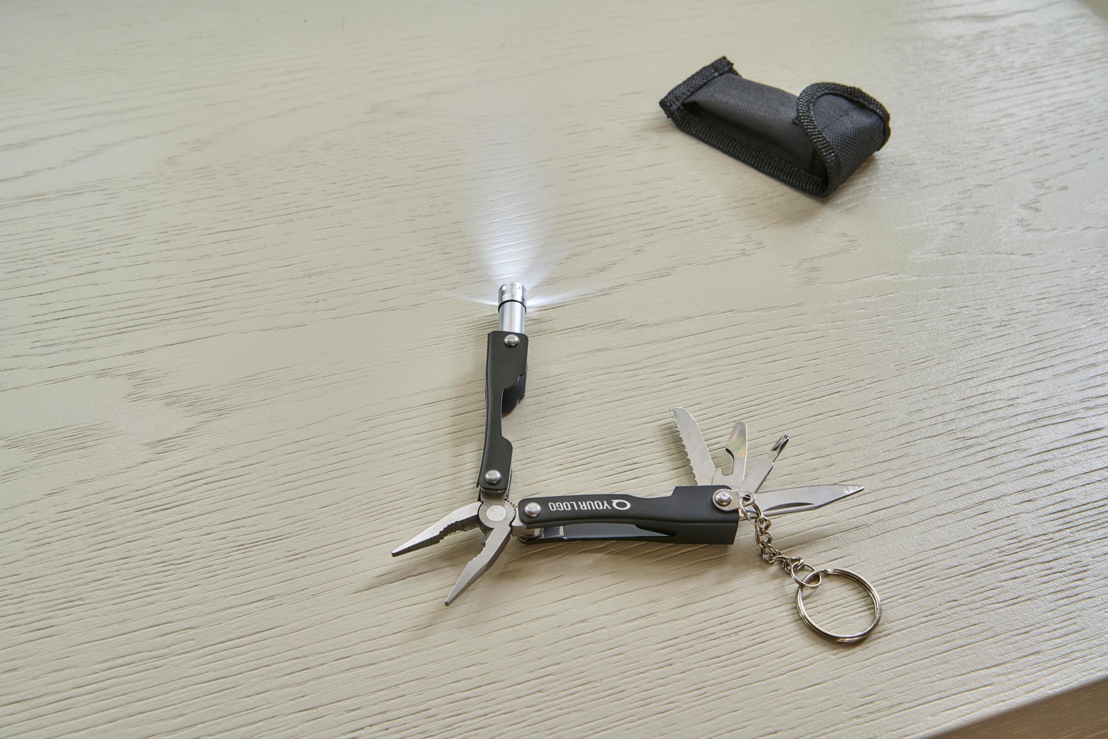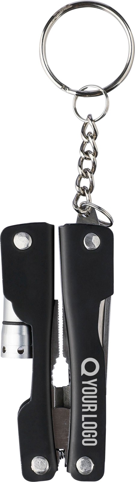 Multi-ferramenta dobrável em aço inoxidável com 10 funções. Com uma única lanterna LED. Apresentada numa bolsa em poliéster 600D com fecho de velcro. Bolsa fixável ao cinto. Inclui pilhas. Apresentado individualmente numa caixa de cartão castanha.
