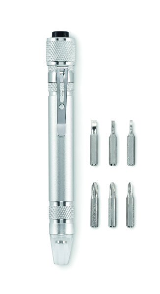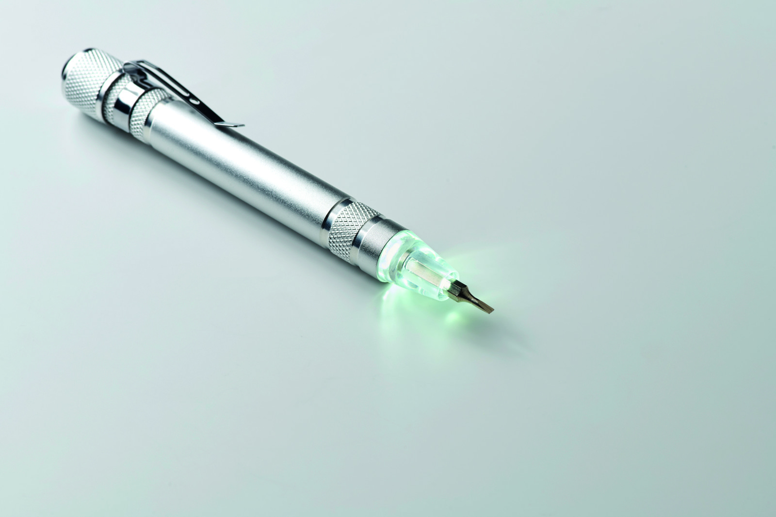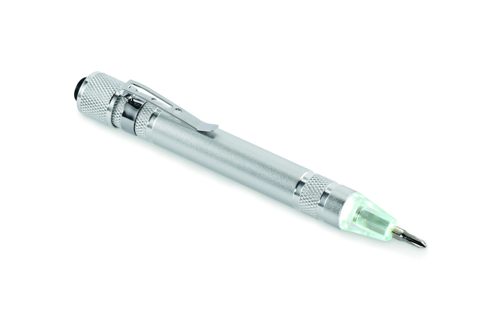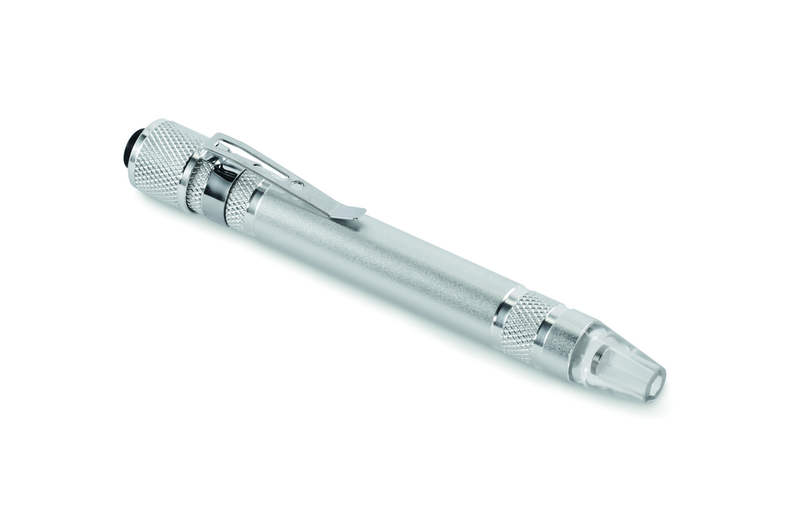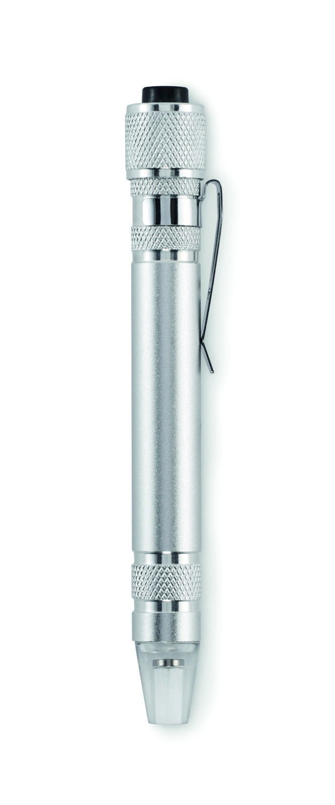 Ferramenta múltipla em alumínio reciclado em forma de caneta com lanterna. Inclui 3 cabeças de chave de fendas tradicional e 3 cabeças de chave de fendas Phillips. 4 pilhas de botão LR41 incluídas.