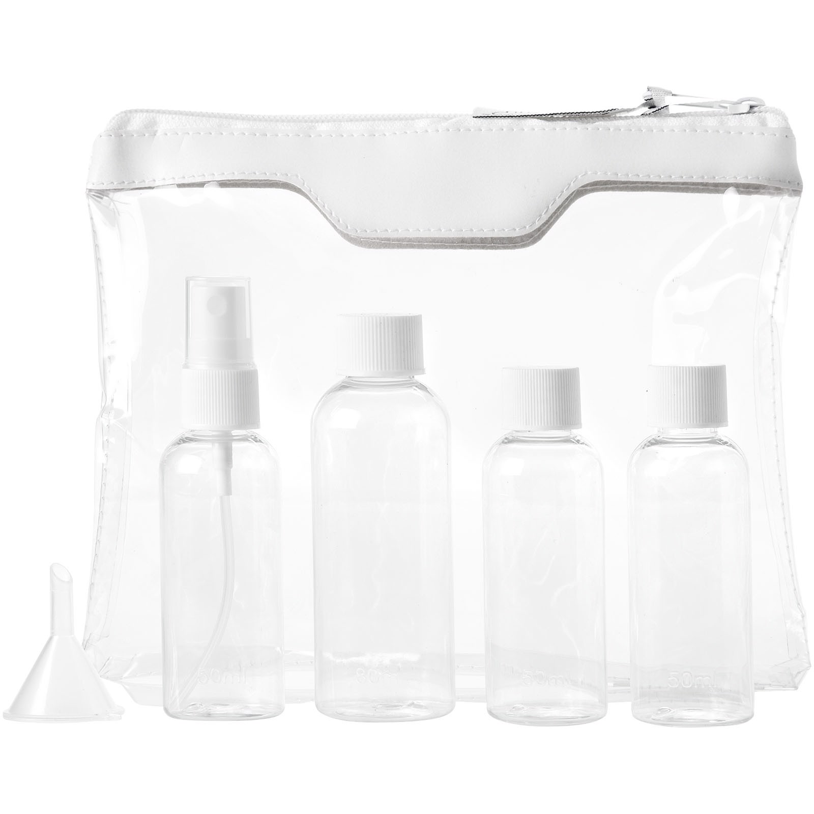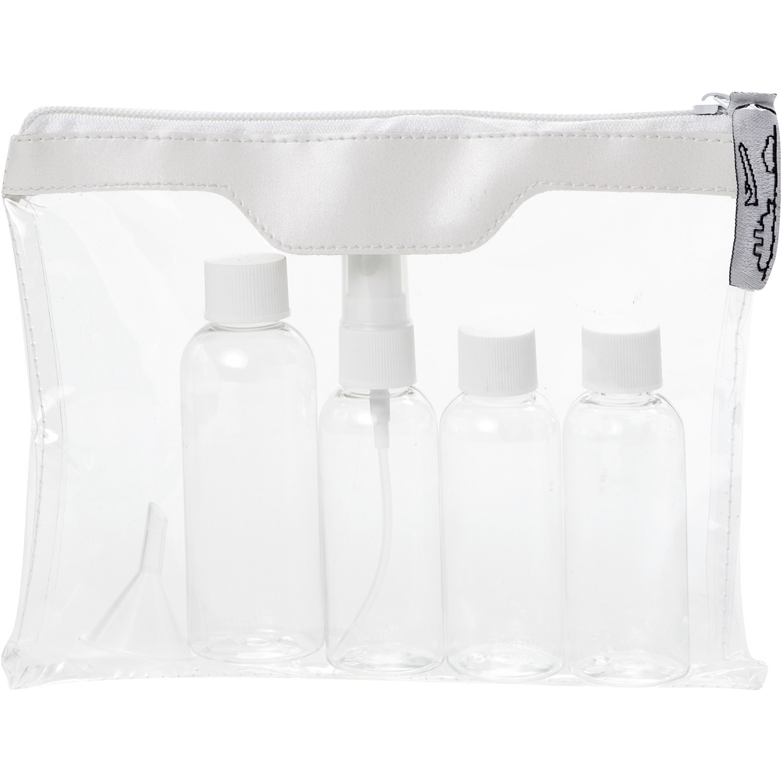 Saco de toilette de viagem aprovado que pode levar consigo a bordo. Inclui 2 frascos de 50 ml, 1 frasco de 90 ml e um vaporizador e funil. Os frascos, o vaporizador e o funil são embalados num saquinho, separado da bolsa. A decoração não está disponível nos componentes.