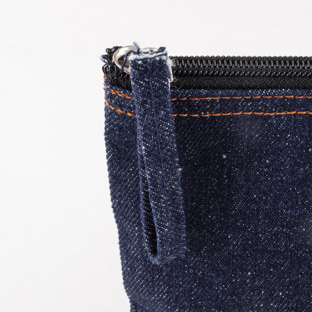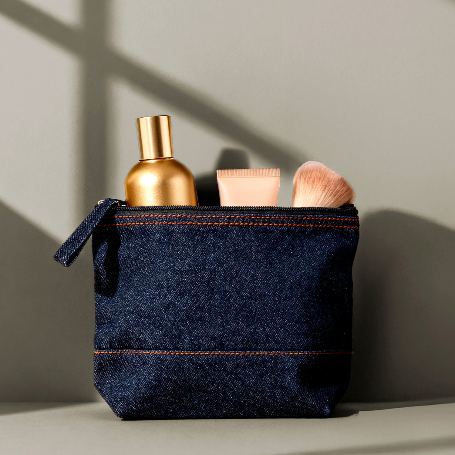 Nécessaire em algodão reciclado e denim de 240 gr/m² com fecho zípper e alça em conjunto.