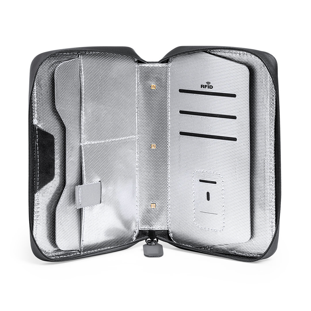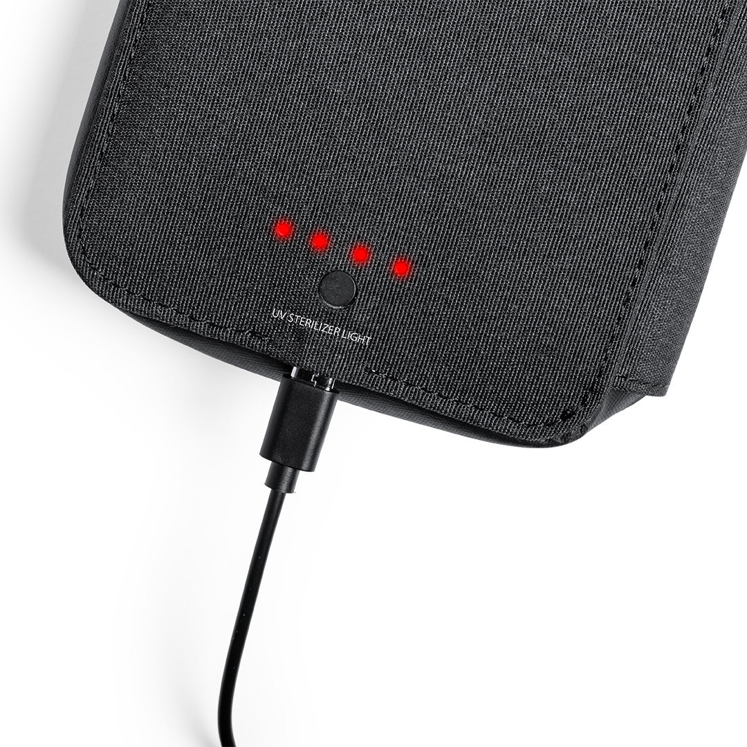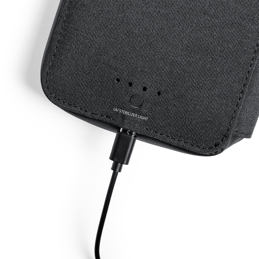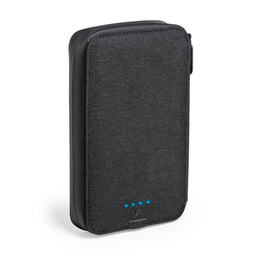 Organizador e esterilizador de luz ultravioleta tipo C, com proteção RFID (Identificação por Rádio Frequência) que mantém seguros os seus dispositivos de transmissão de identidade. Especialmente desenhado para a eliminação de microrganismos e bactérias em smartphones e outros objetos de uso quodidiano. Fabricada em resistente poliéster 600D de acabamento denim, com fecho magnético de segurança em puxador para um uso seguro do dispositivo. Inclui 4 porta-cartões interiores + bolso exterior. Apresentado em atrativa caixa individual de design.Potência LED 1.2W e longitude de onda 275nm.Tempo de esterilização com função auto-apagado de 1 e 3 minutos.Disponível manual de utilizador em espanhol e inglês.Disponível certificação CE, RoHS e de efetividade germicida.Para um uso adequado do produto, evitar o contato com a pele e os olhos. Luz Ultravioleta. Protetor RFID. Conexão USB