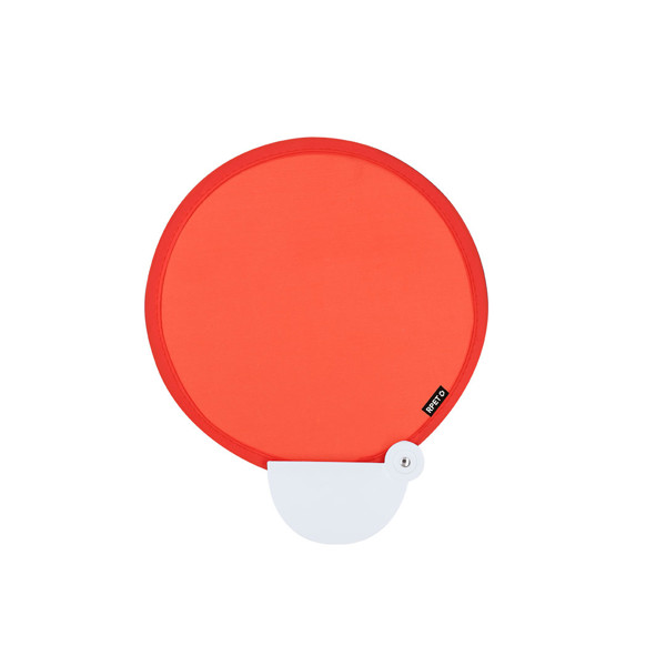 Leque dobrável em RPET. Fácil de transportar graças ao sistema de dobragem, inclui etiqueta distintiva RPET.O material RPET é feito a partir de plástico reciclado, promovendo a reutilização de resíduos plásticos e ajudando na sustentabilidade do planeta. Dobrável