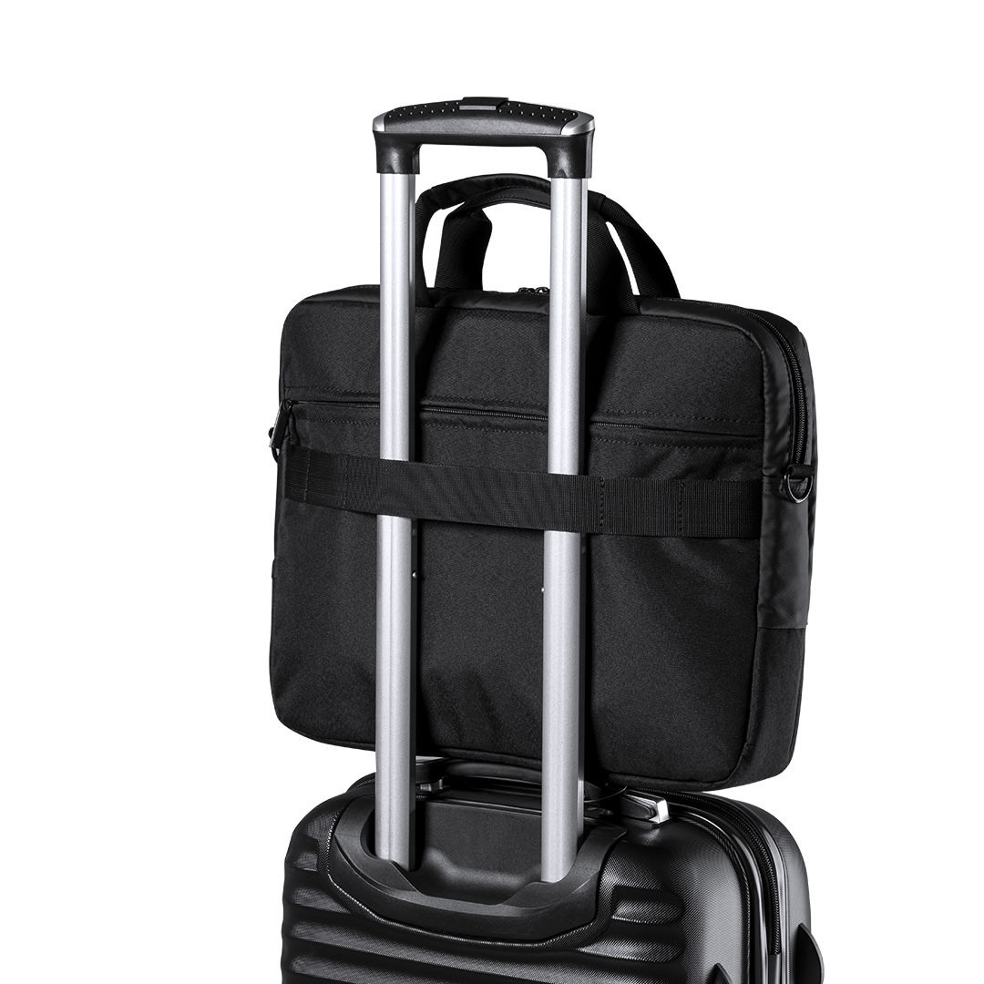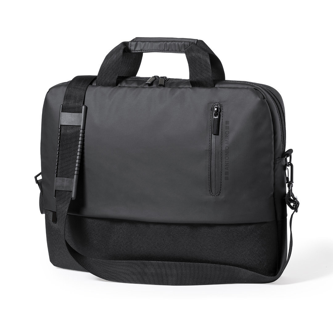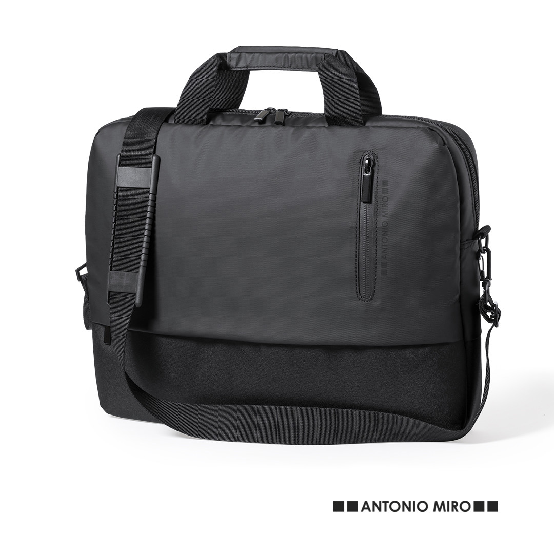 Pasta Antonio Miró de qualidade premium em resistente poliéster 600D. Com um design sóbrio e compartimento acolchoado para portátil de até 15polegadas. Com confortável pega de transporte reforçada, fechos de correr com puxadores metálicos e bolso frontal. Logotipo da marca na frente. Acolchoado. Bolso Acolchoado para Portátil