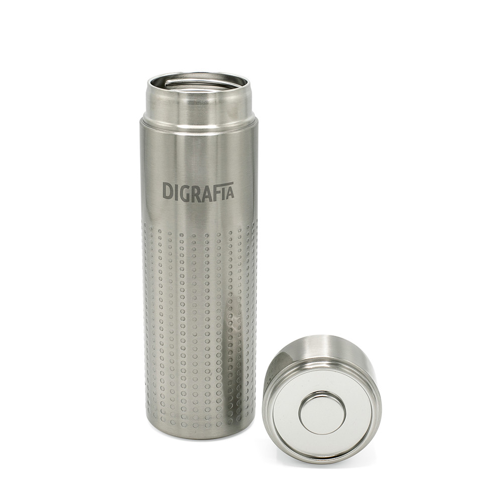 A Perfora, com capacidade de 540 ml (500 ml líquidos), é feita em aço inoxidável reciclado. O seu isolamento a vácuo de parede dupla mantém a bebida quente durante 14 horas e fria durante 48 horas. Apresenta um padrão decorativo único. Uma escolha ecológica para se manter fresco. Embalada individualmente numa caixa kraft amiga do ambiente.