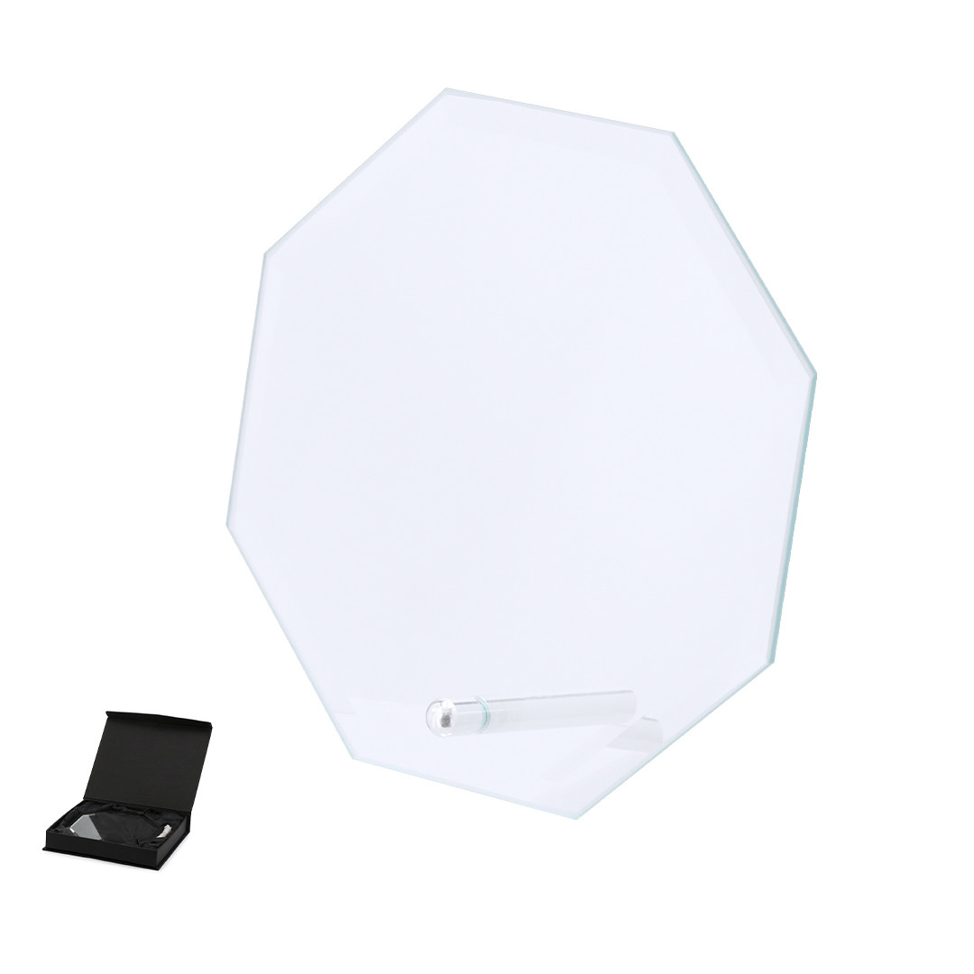 Placa de troféu em vidro grosso com elegante design octogonal. especialmente projetado para impressão a laser e apresentado em um caso de proteção individual.