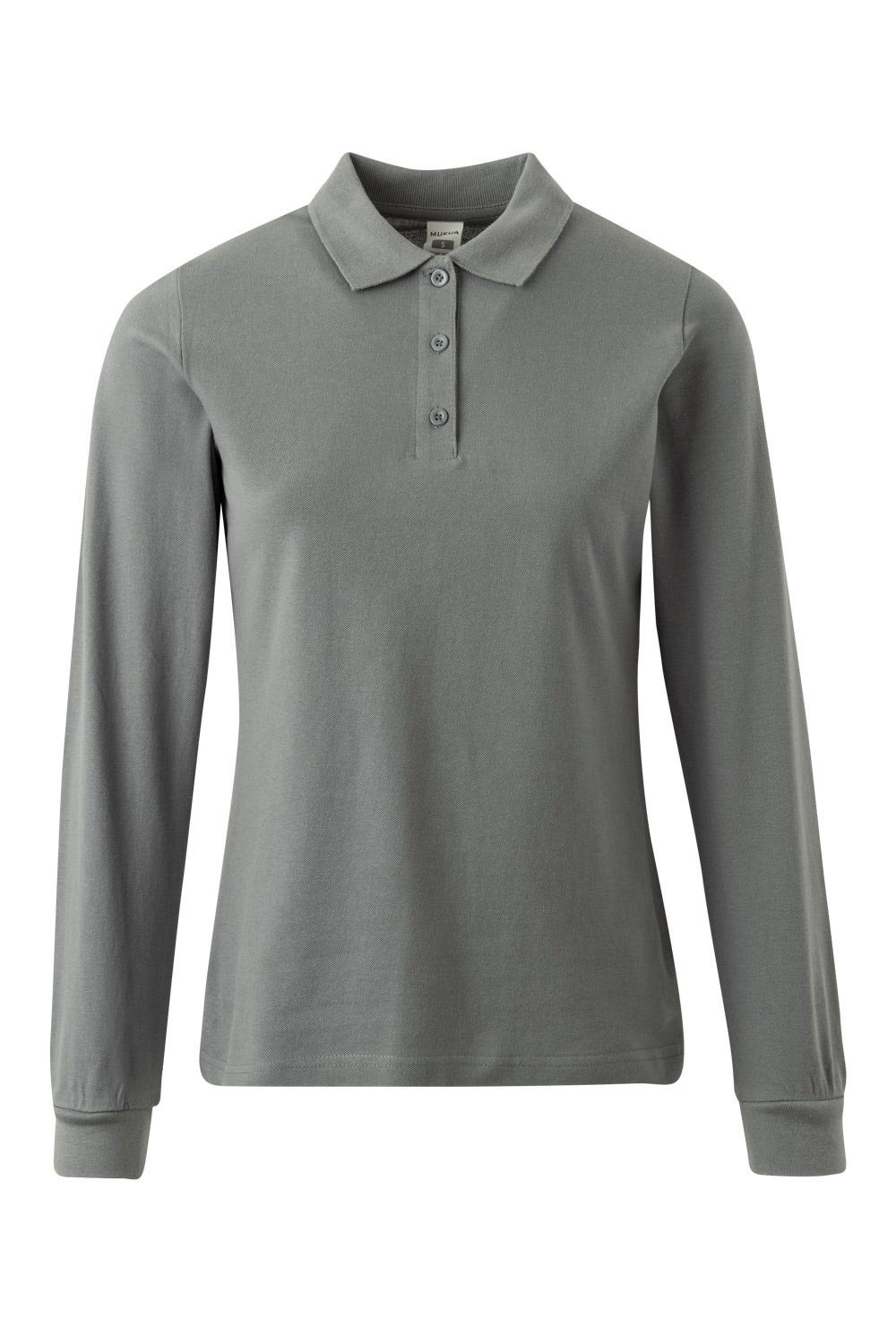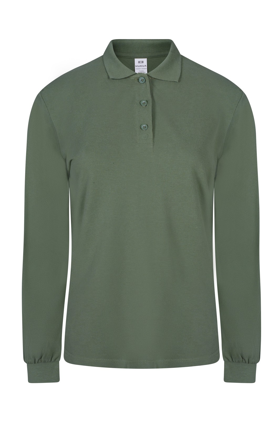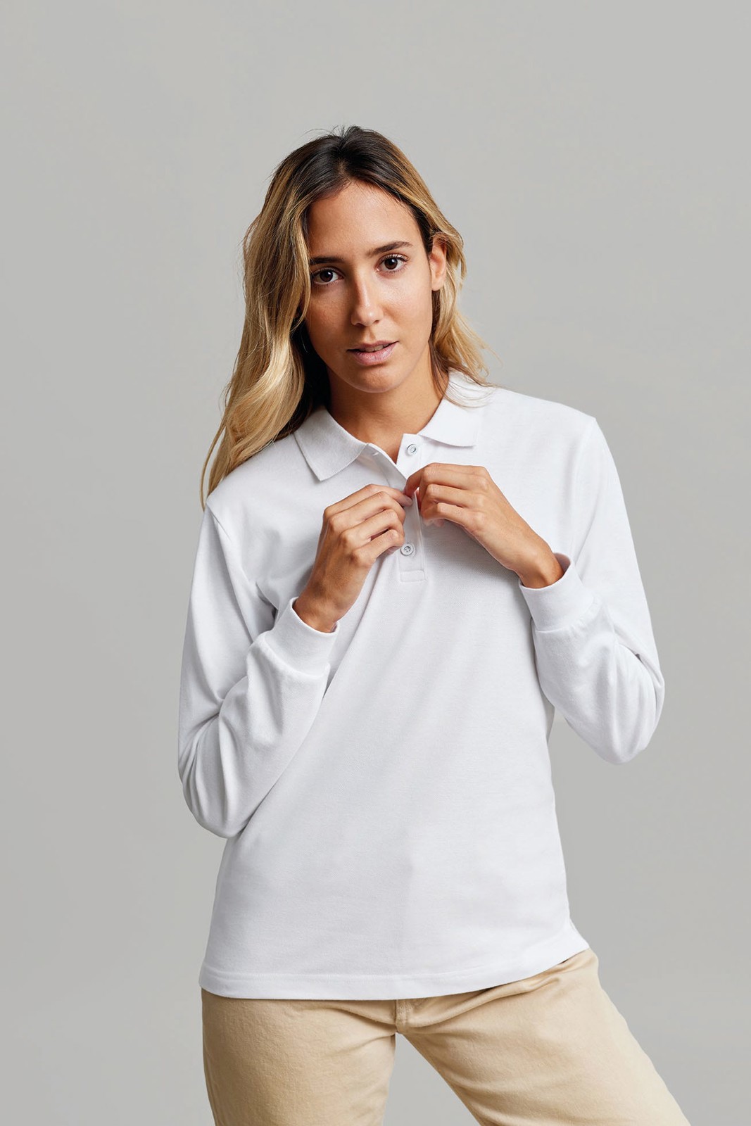 Polo WOMAN manga comprida. Malha Piqué. 100% Algodão RingSpun pré-encolhido. 210 g/m². Gola com carcela de 3 botões Tapa costuras reforçada no interior da gola para evitar deformação. Gola e bainha da manga em canelado 1x1 Punho com elastano para maior elasticidade e para evitar deformações Aberturas laterais 100% ALGODÃO PRÉ-ENCOLHIDO 200 GSM