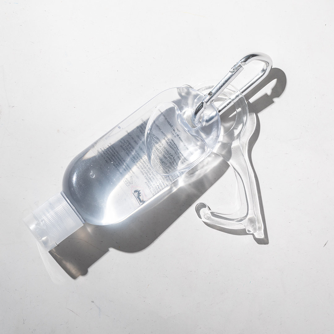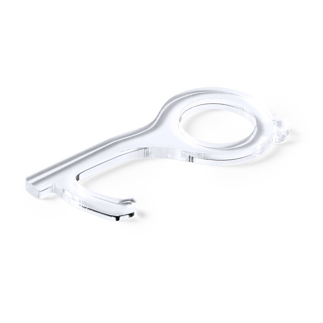 Porta-chaves higiénico anti-contato, fabricado em original e resistente material acrílico de acabamento transparente. Especialmente desenhado para evitar tocar com as mãos superfícies de uso comum (maçanetas de portas, interruptores, torneias de uso público, caixas multibanco...). Com cómodo recorte para o dedo e apresentado em bolsa individual de desenho. Recomendado para impressão em tampografia.